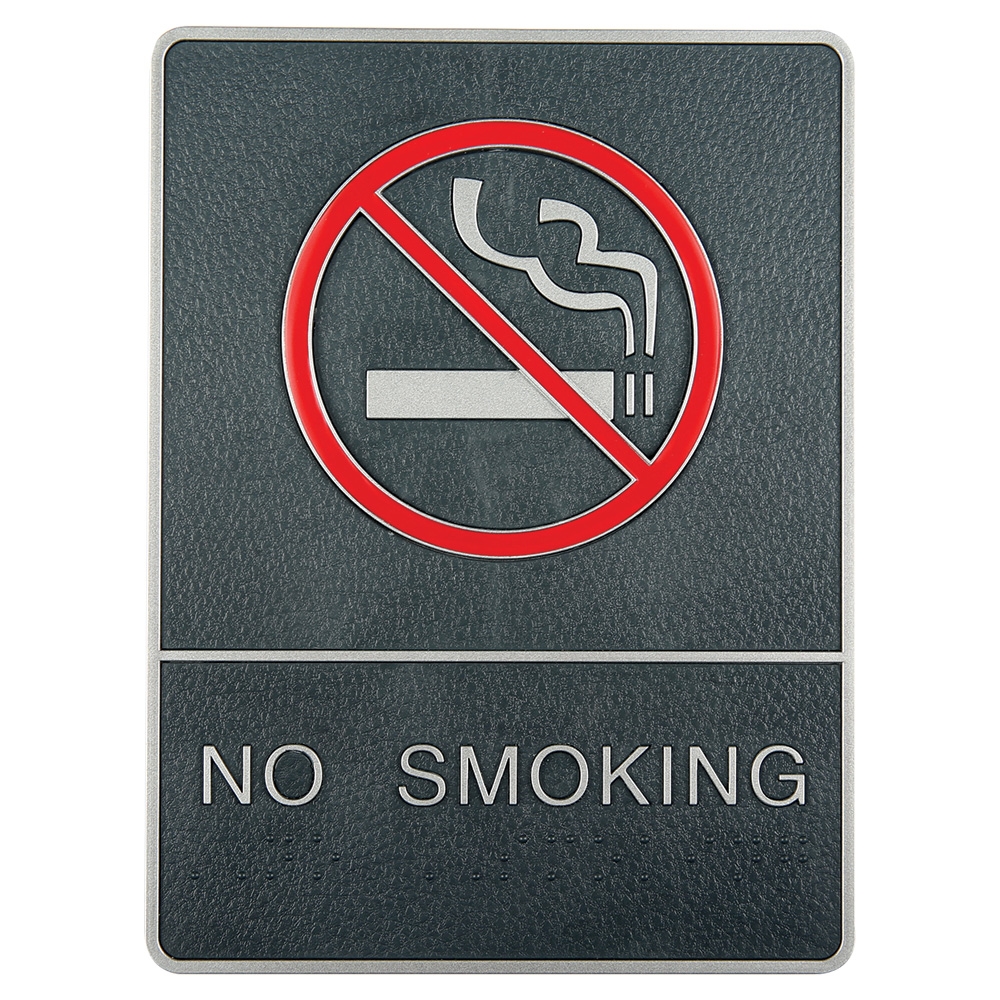 Krom innrammet NO SMOKING skilt med punktskrift.