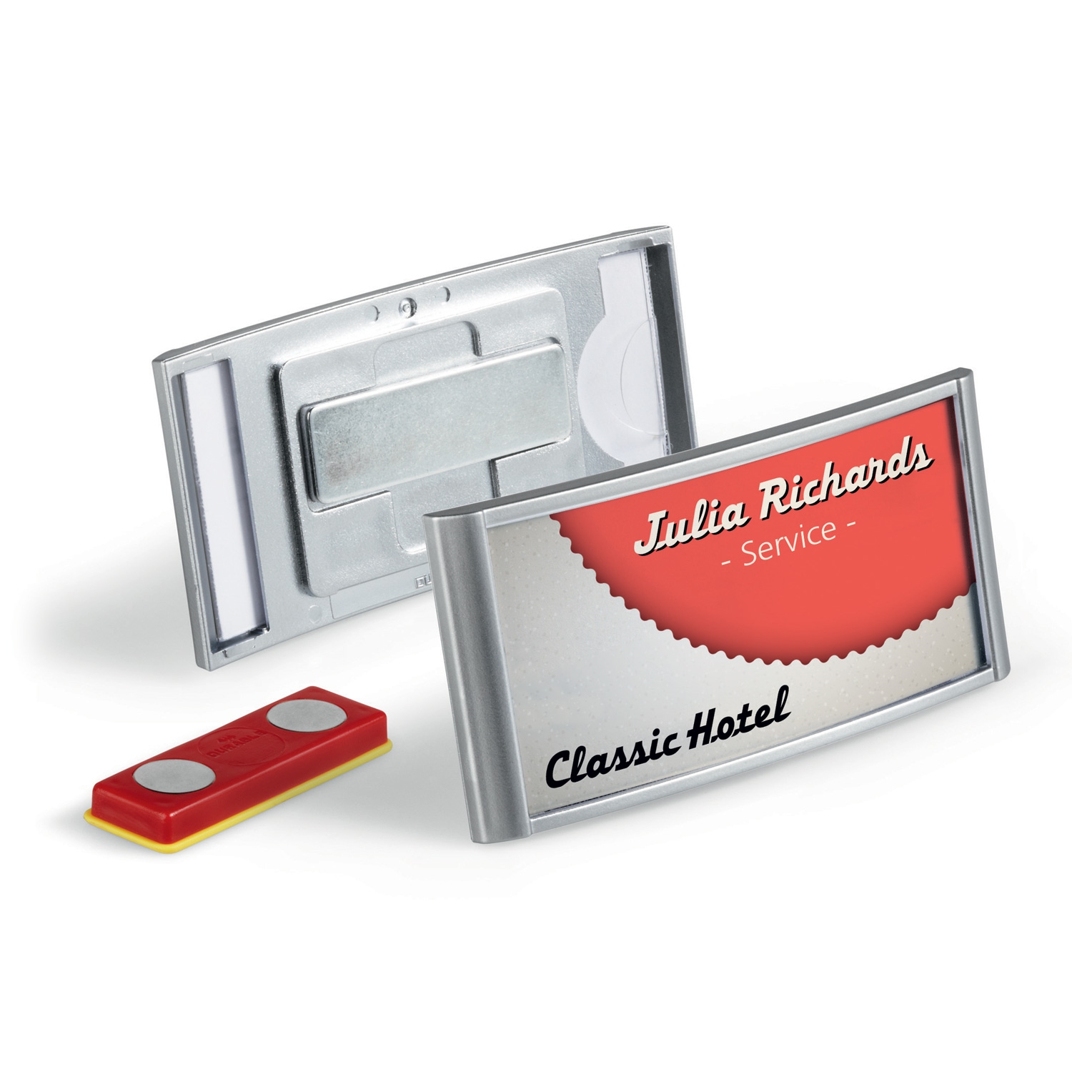 Navneskilt CLASSIC med sølv finish og magnet til innstikk: 74x34mm (BxH).