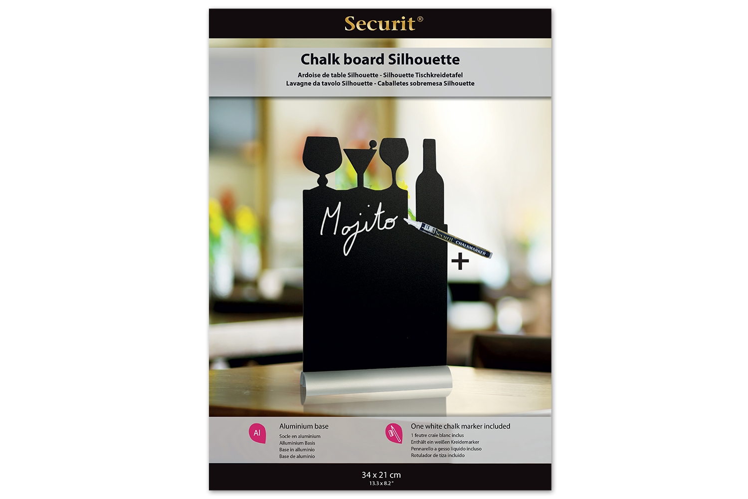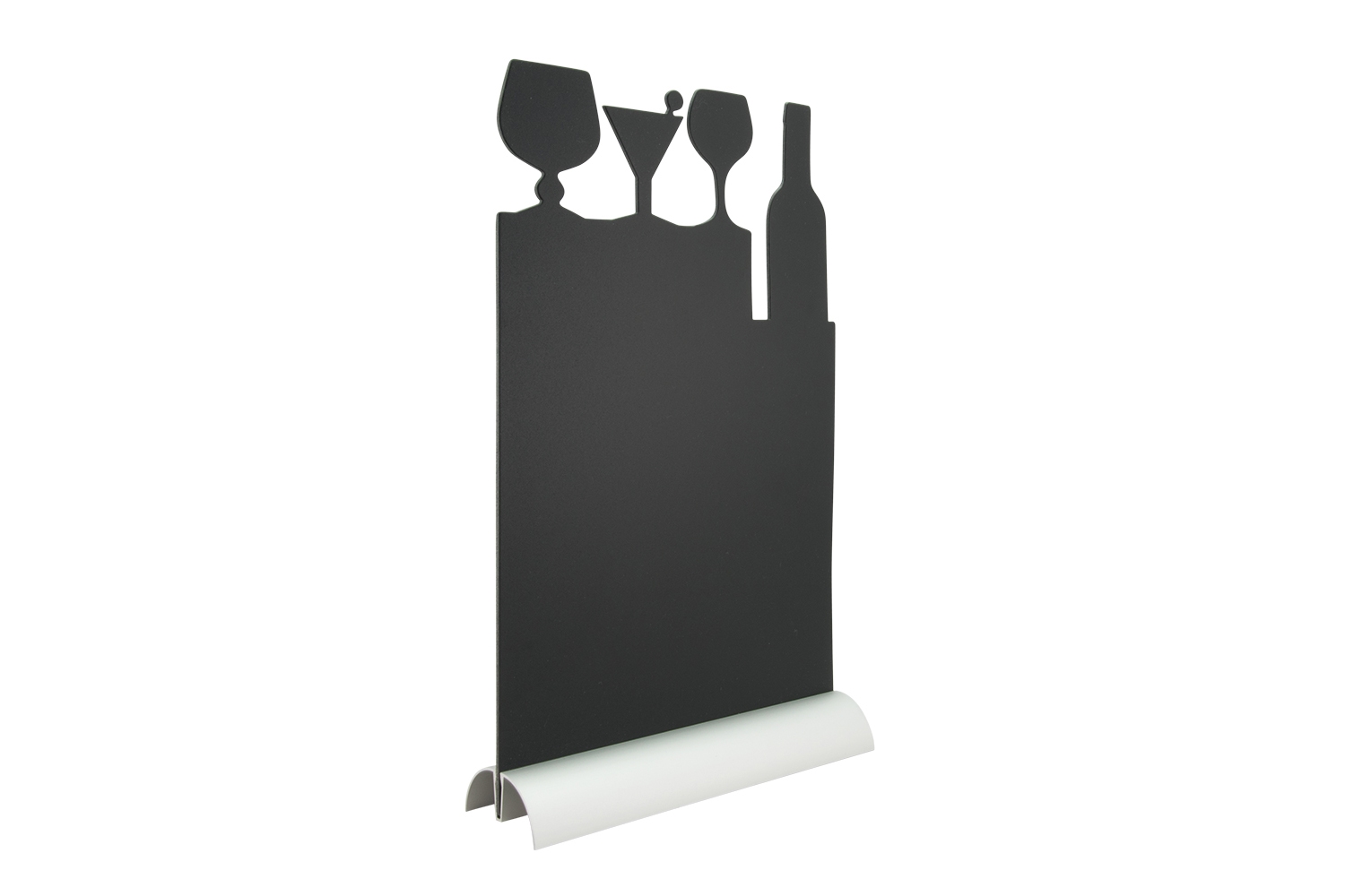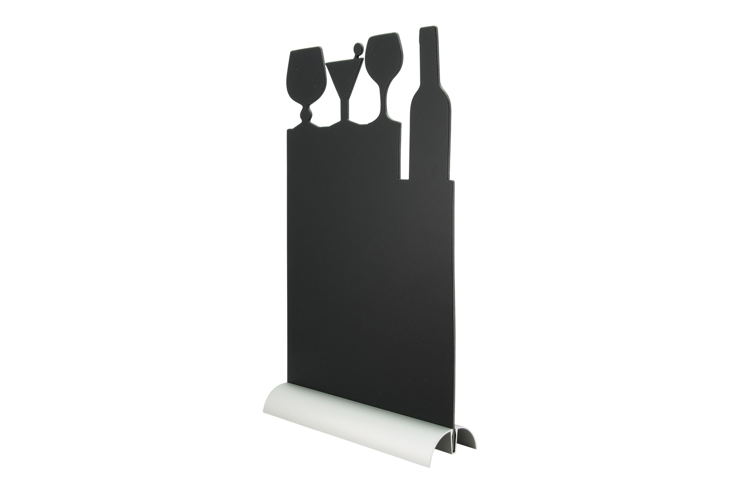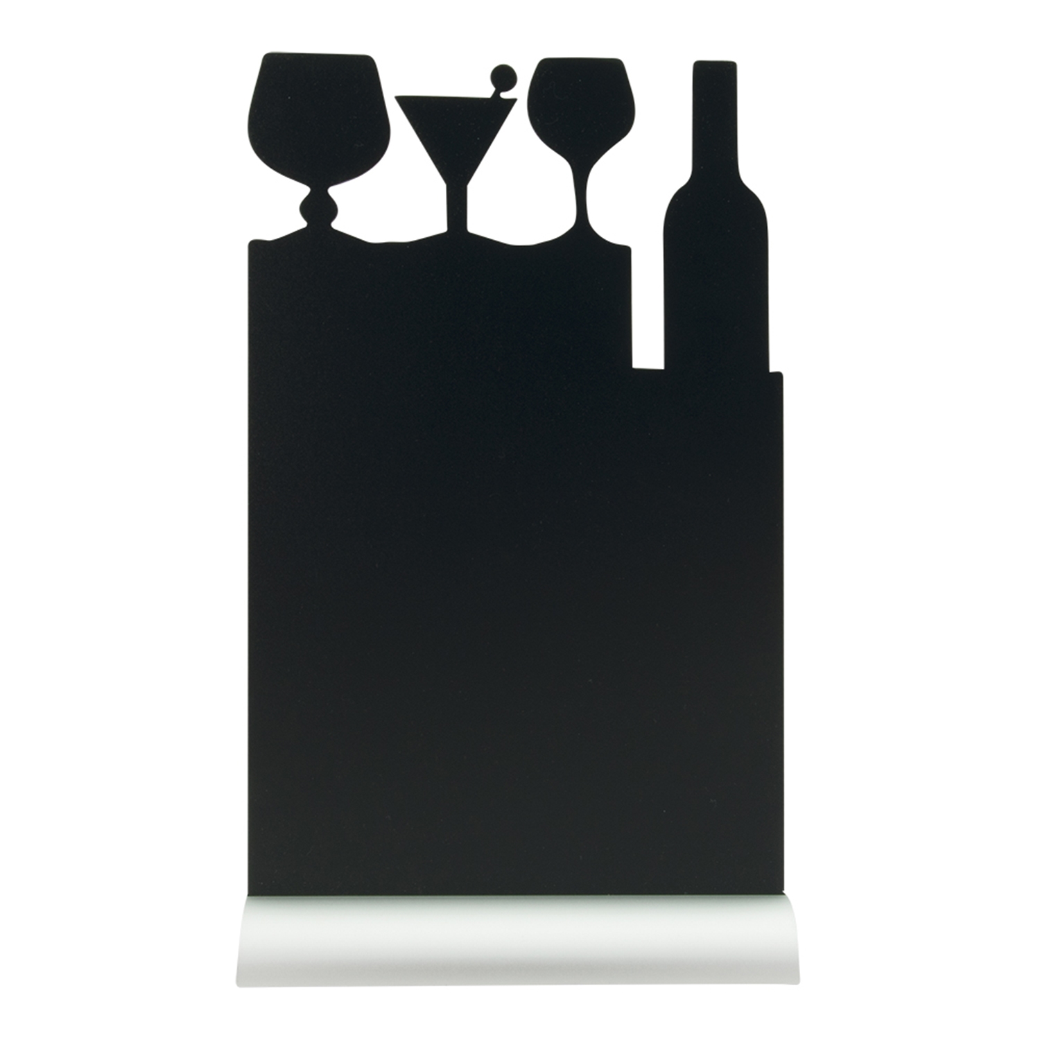 Dobbelsidig cocktail silhuett tavleskilt til bord, med stilren aluminums fot. Hvit 1-2 mm kritt marker penn følger med. Silhuetten kan også tas opp av foten, og flyttes over til en annen av samme slags. Et åpenbart valg for Restauranter, barer, nattklubber, hoteller og mange fler!