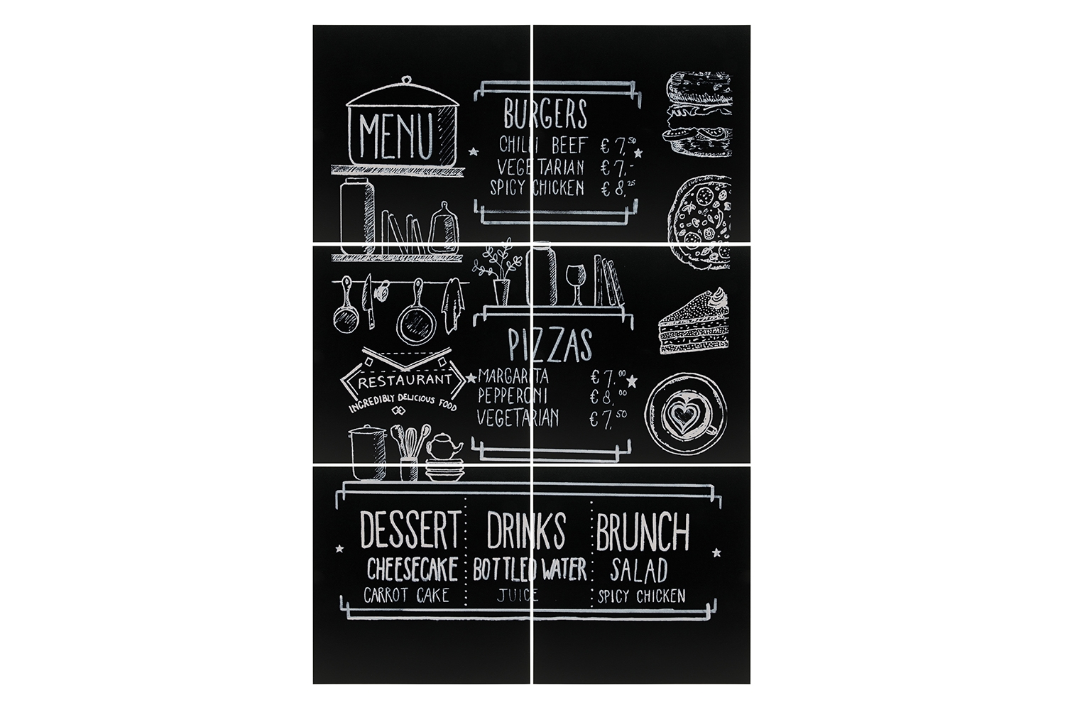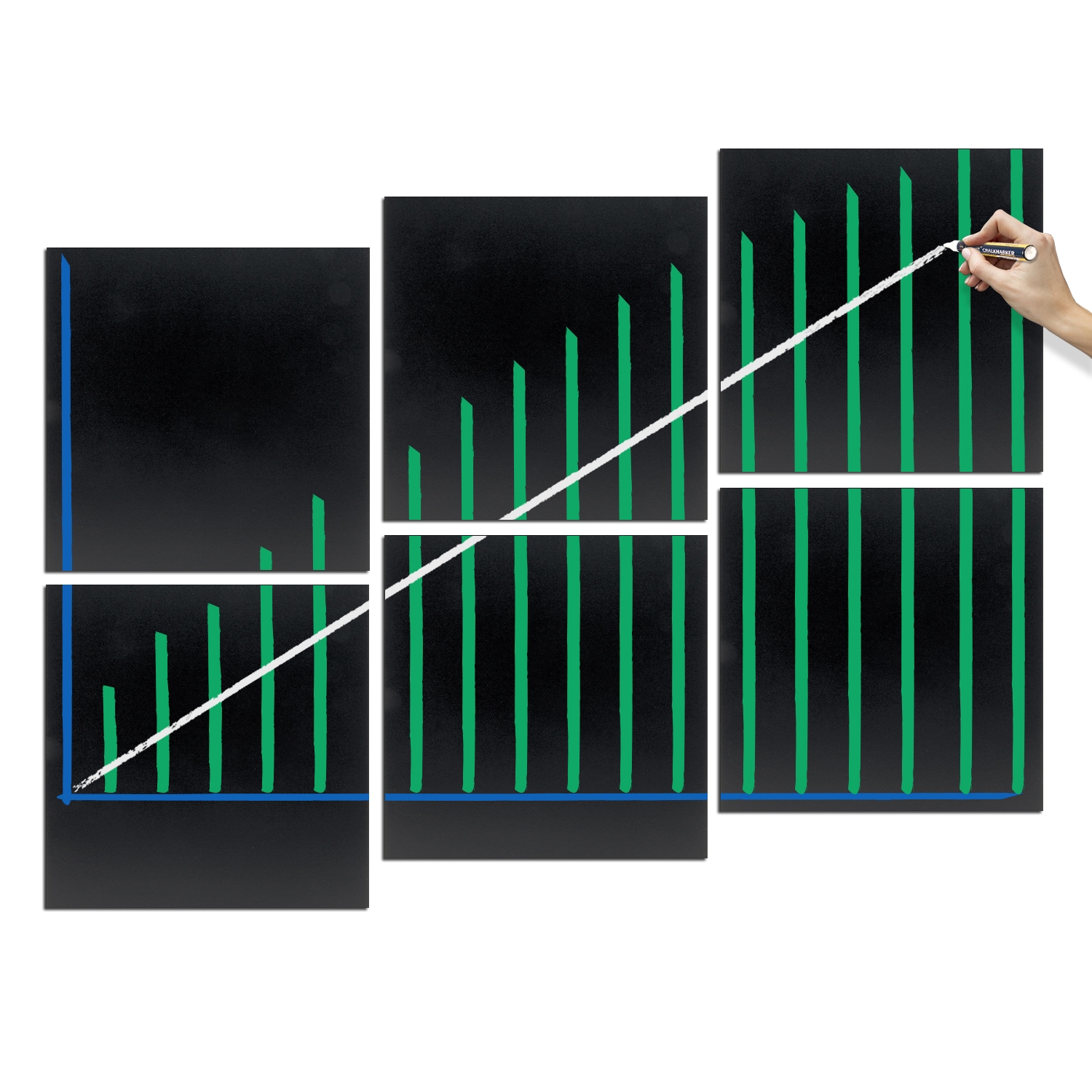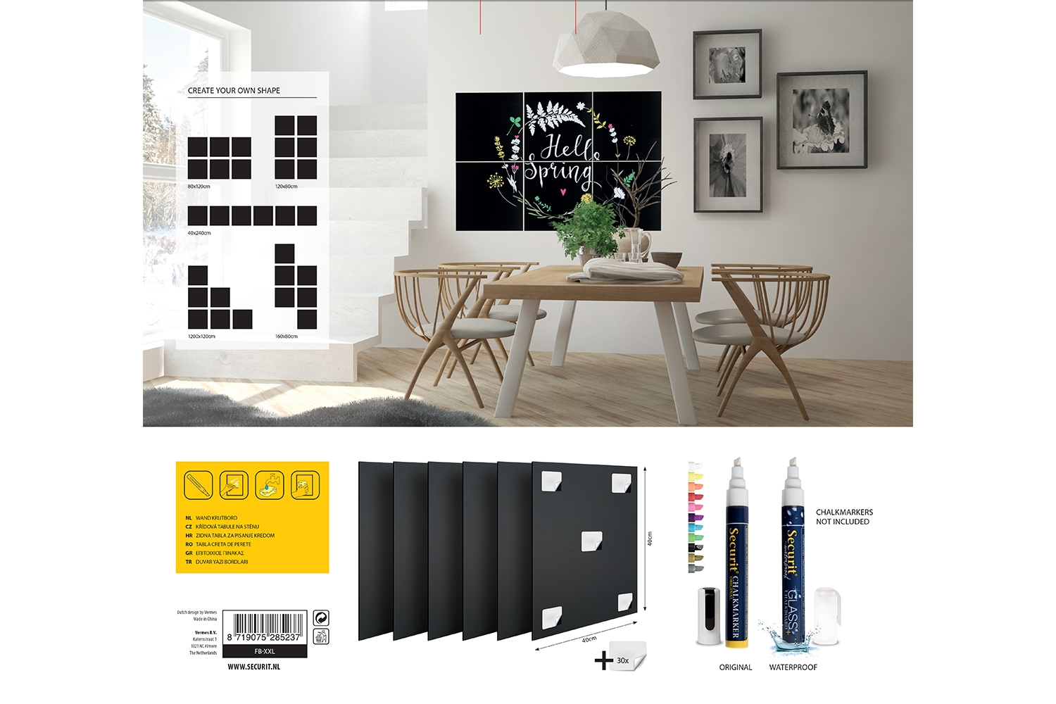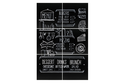 Creative kritt-tavle set til vegg. Leveres med 6 store presisjons kuttet, fleksible kritt-tavler i 40x40 format. Velegnede til bruk med kritt marker penne. Tavlene kan rengjøres med vann og klut eller våres krittmarker rengjøringsprodukter. Monteres i en design etter eget valg. UV-, støt-, smuss- og ripefaste materialer. Klebeputer er montert på baksiden av hver plate ( 30 stk i alt )