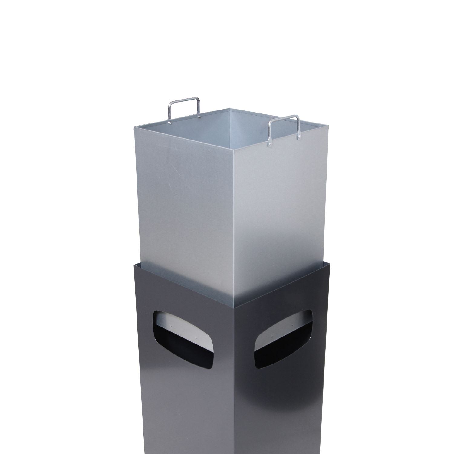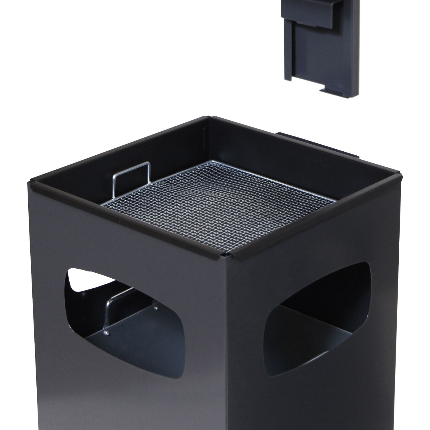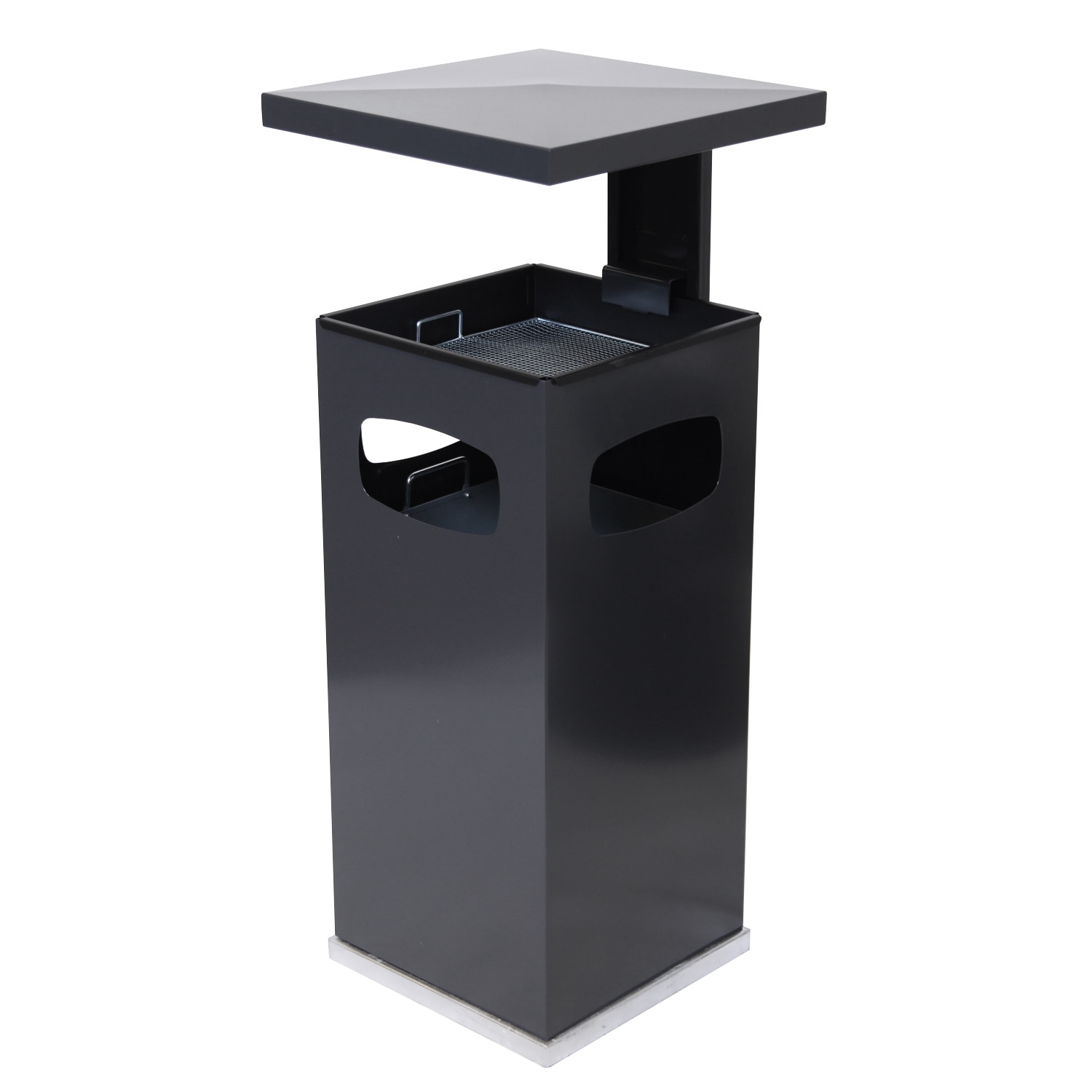 Søppelbøtte med åpning i 3 sider, produseret i galvanisert og pulverlakkert stål.