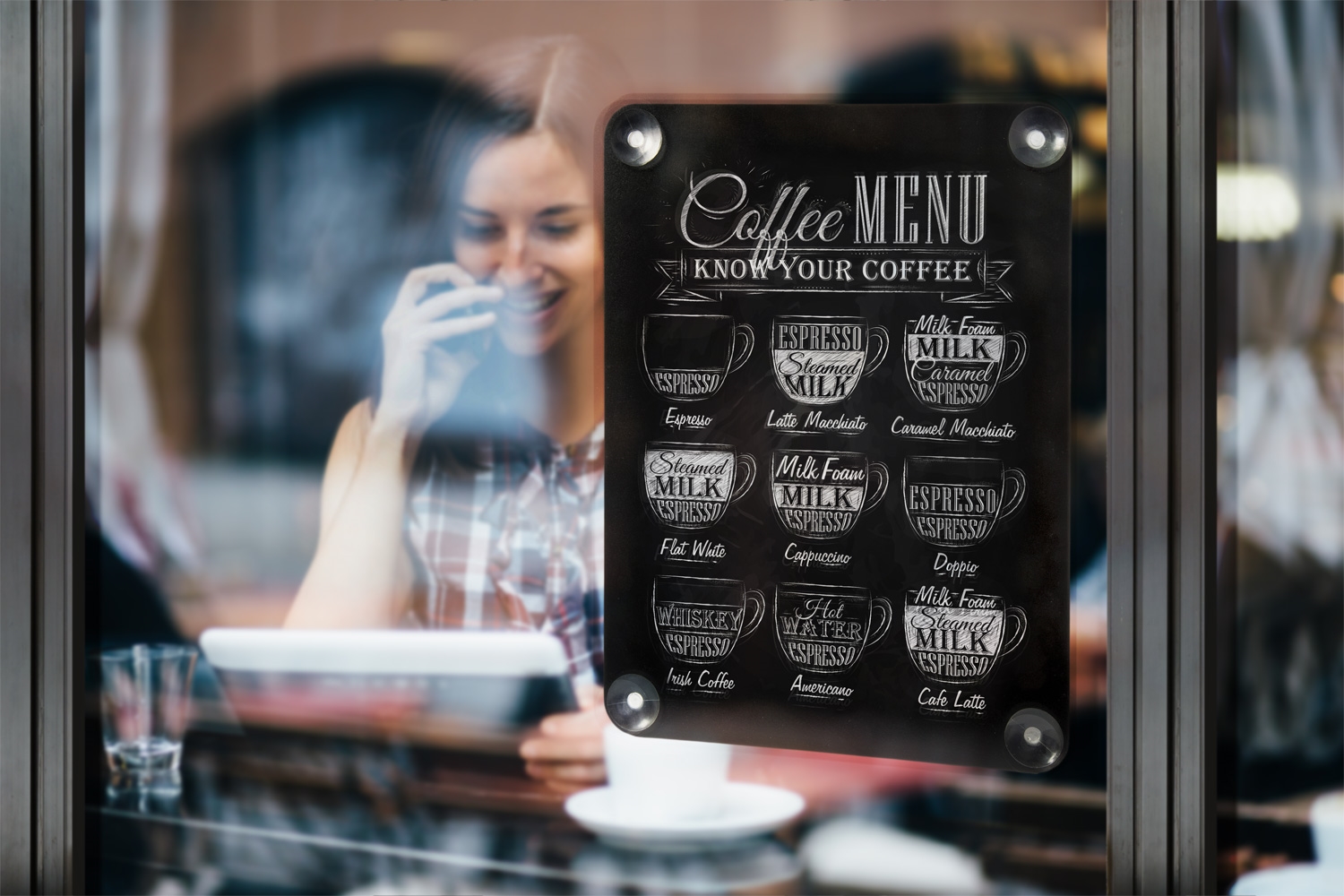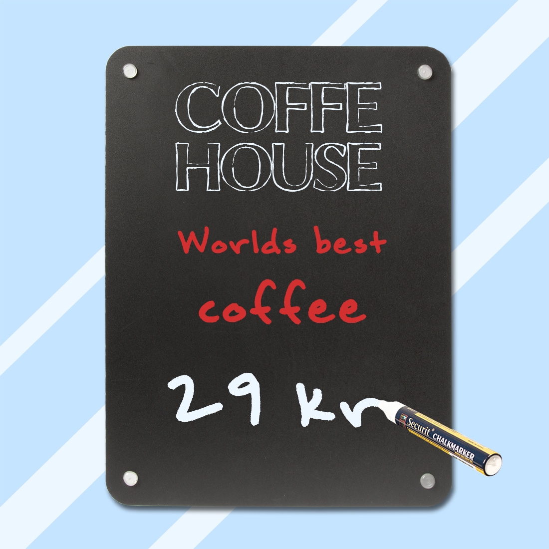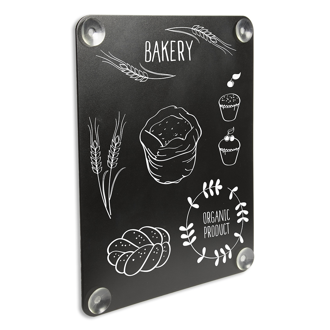 Dobbelsidig kritt-tavle montert med 4 sugekopper, som holder den sikkert på vinduer eller andre glatte overflater.