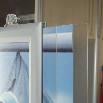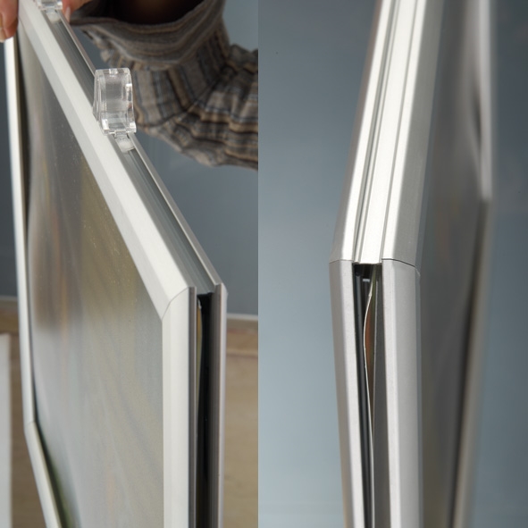 Disse flotte dobbelsidige rammer er produsert i alu og er superlette at bruke. Utskifte av plakater er mye enkelt, takket være "Slide-in" funksjonen.