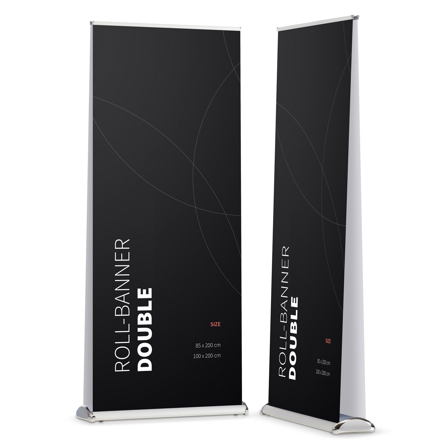 DOBBELTSIDIG roll-up system i stilren design som står stabilt. Produsert i sølv-eloxeret aluminium.
