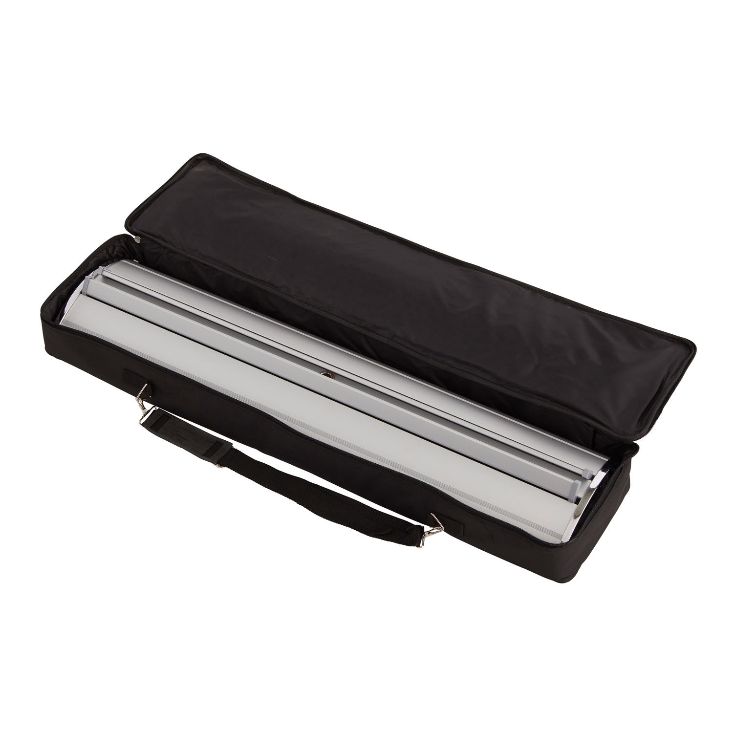 Leveres komplett og klar til bruk med system, banner, print og kraftig svart luksus bæreveske.