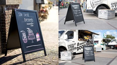 Duplo sandwichskilt er montert med svarte tavleplater. De er ideelle å skrive på med vår Securit krittpenn, som du finner under tilbehør. Vi anbefaler ikke å bruke vanlig kritt på disse tavlene, siden dette kan redusere tavlenes levetid betydelig.