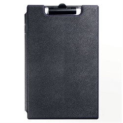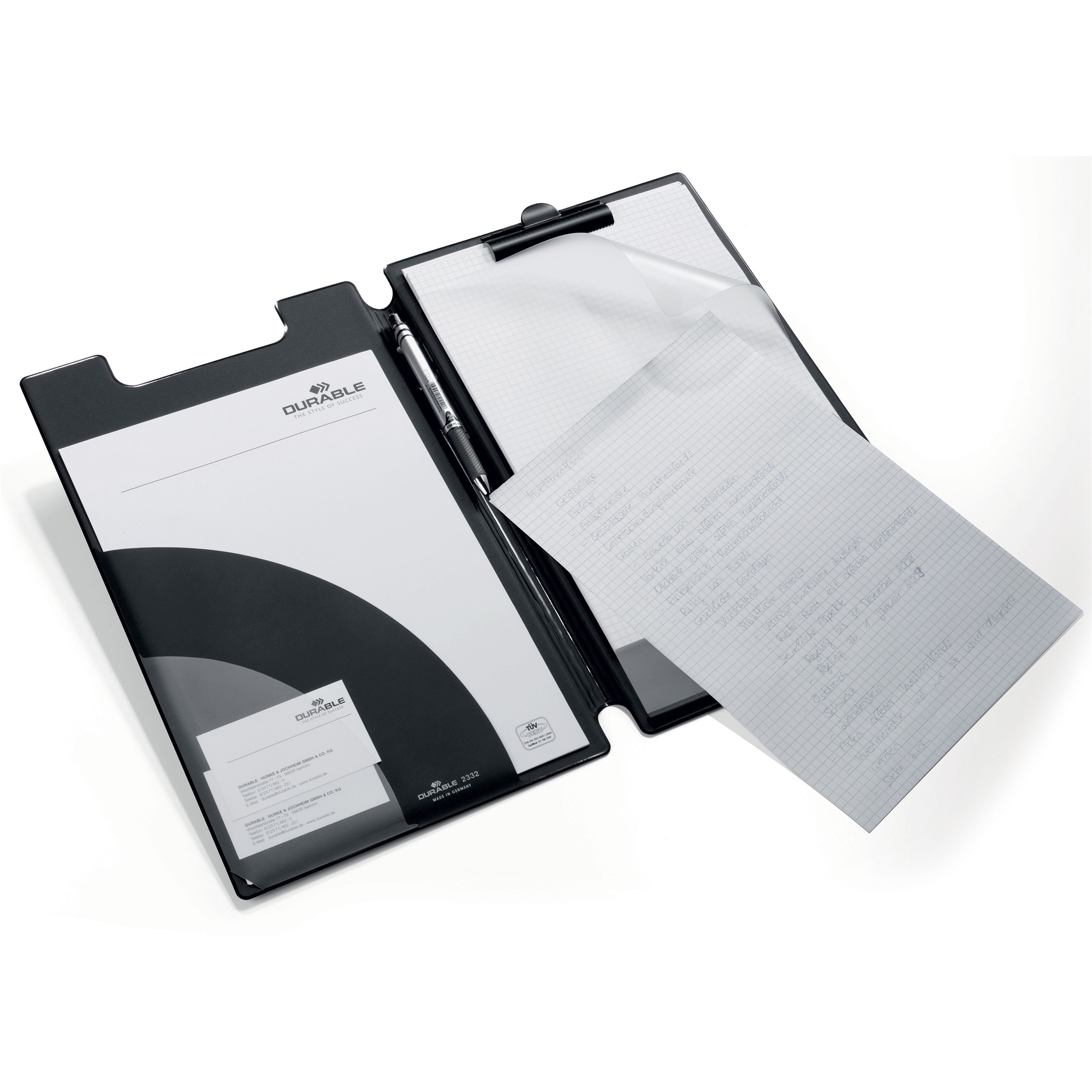 Skriveplaten er utstyrt med en front som beskytter papirene dine mot å bli skitne, en kraftig klemme på toppen som holder papirene på plass, 2 innvendige lommer for oppbevaring av løse papirer og visittkort på innsiden av fronten og en penneholder.