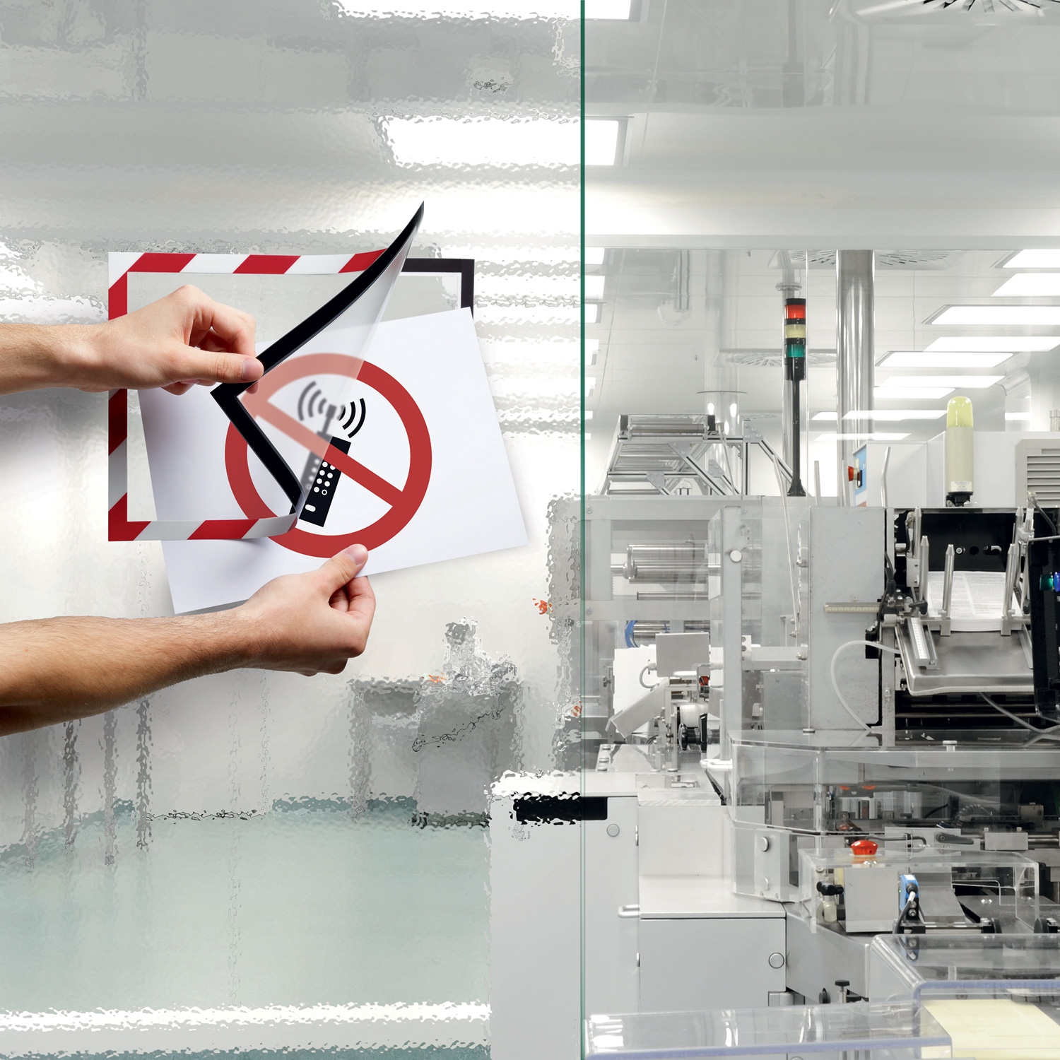 Den selvklebende informasjonsrammen i to varselfarger fra DURAFRAME® SECURITY er den ideelle løsningen for varselskilt i A4-format på faste overflater.