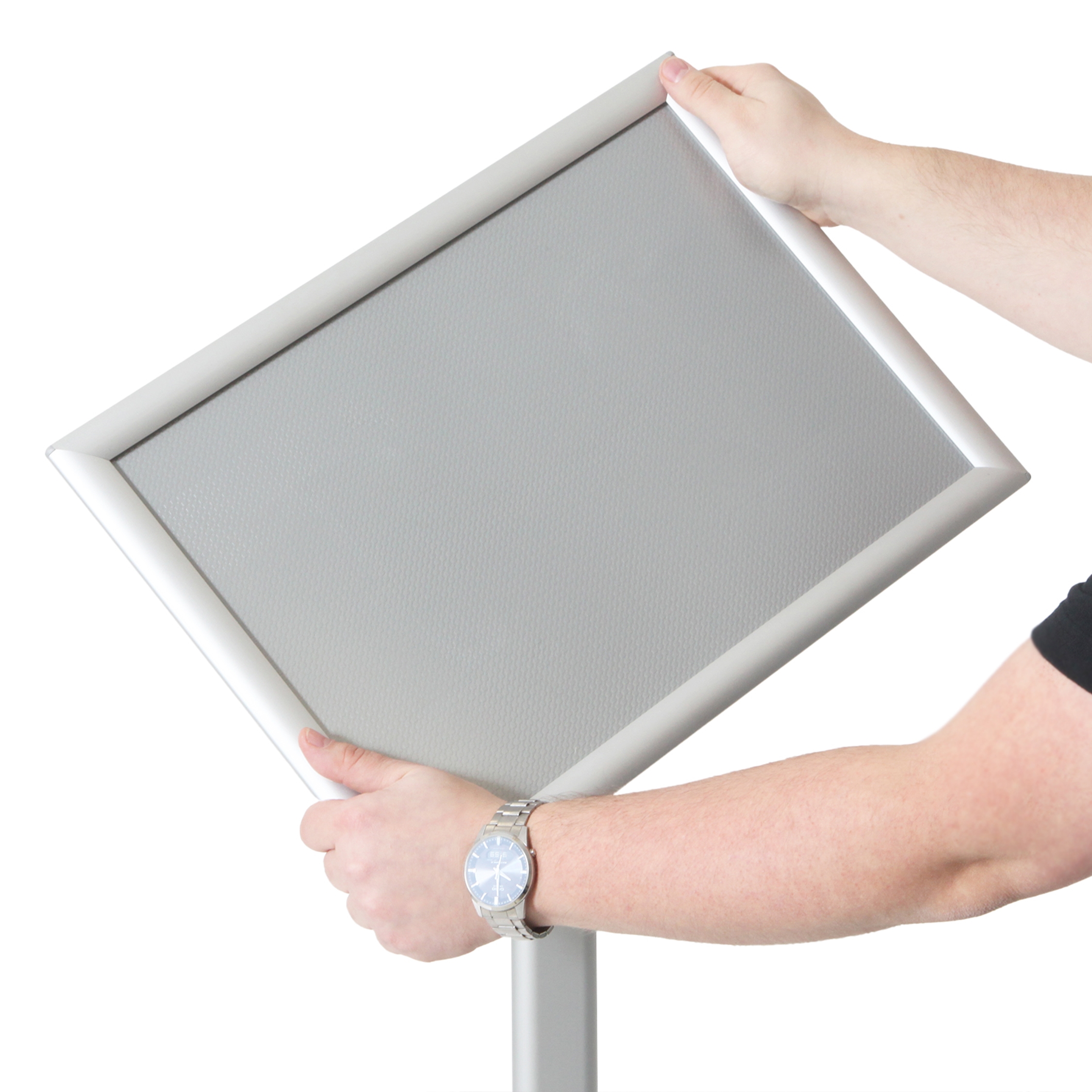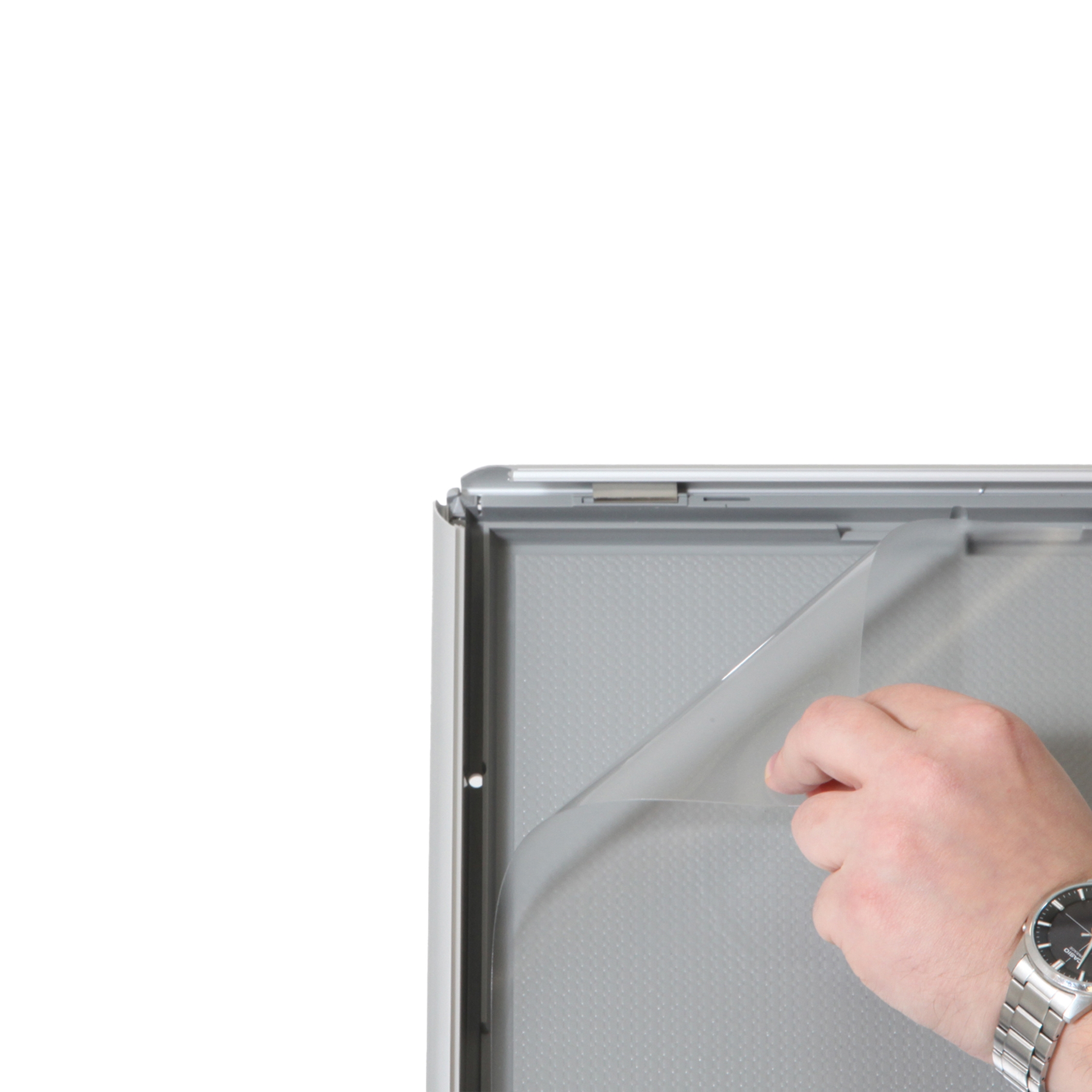 Montert med 25 mm klikkrammer og APET-frontplate med antirefleks som gjør utskiftning av budskapet enkelt.