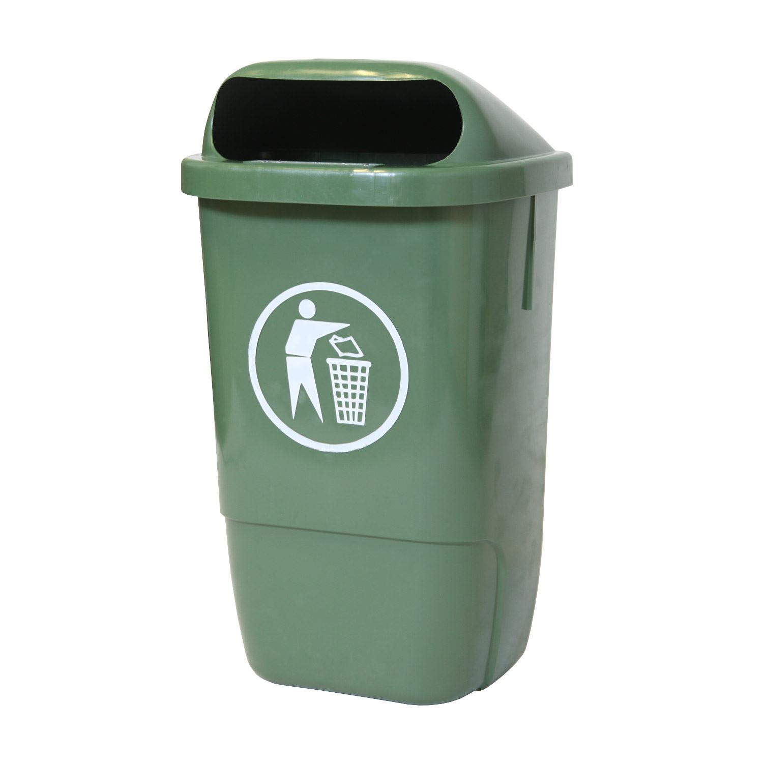 Prisbillige 50 liter søppelbøtte til vegg av plast, med innbygget metallplate til at stumpe sigarettsneiper på. Søppelbøtten er lettvektig og lett at montere / avmontere.