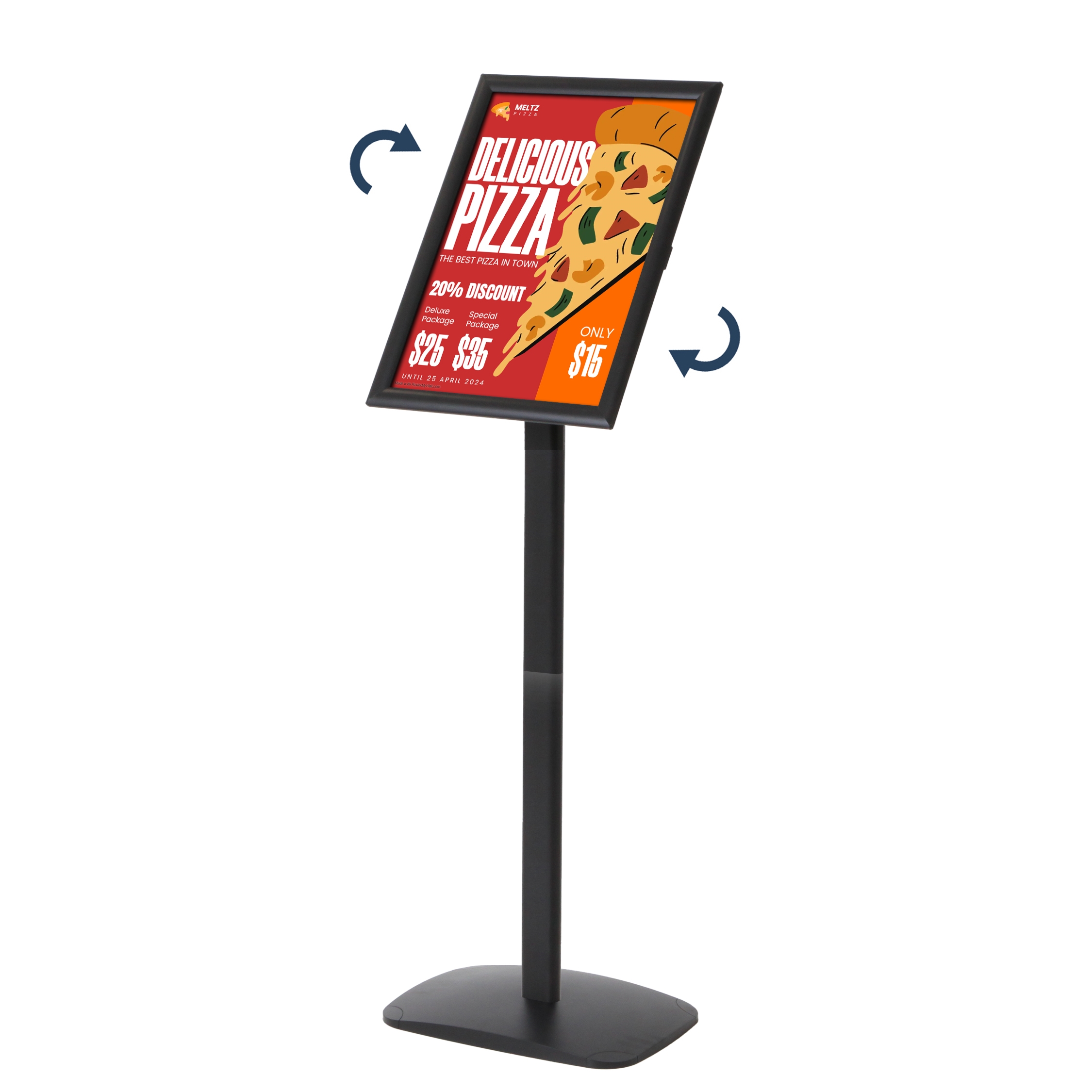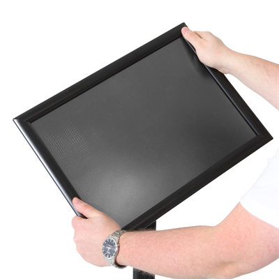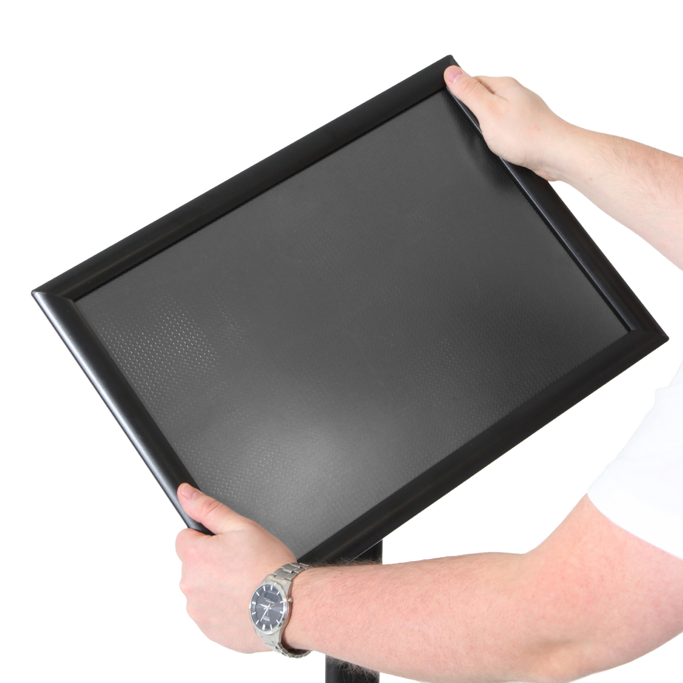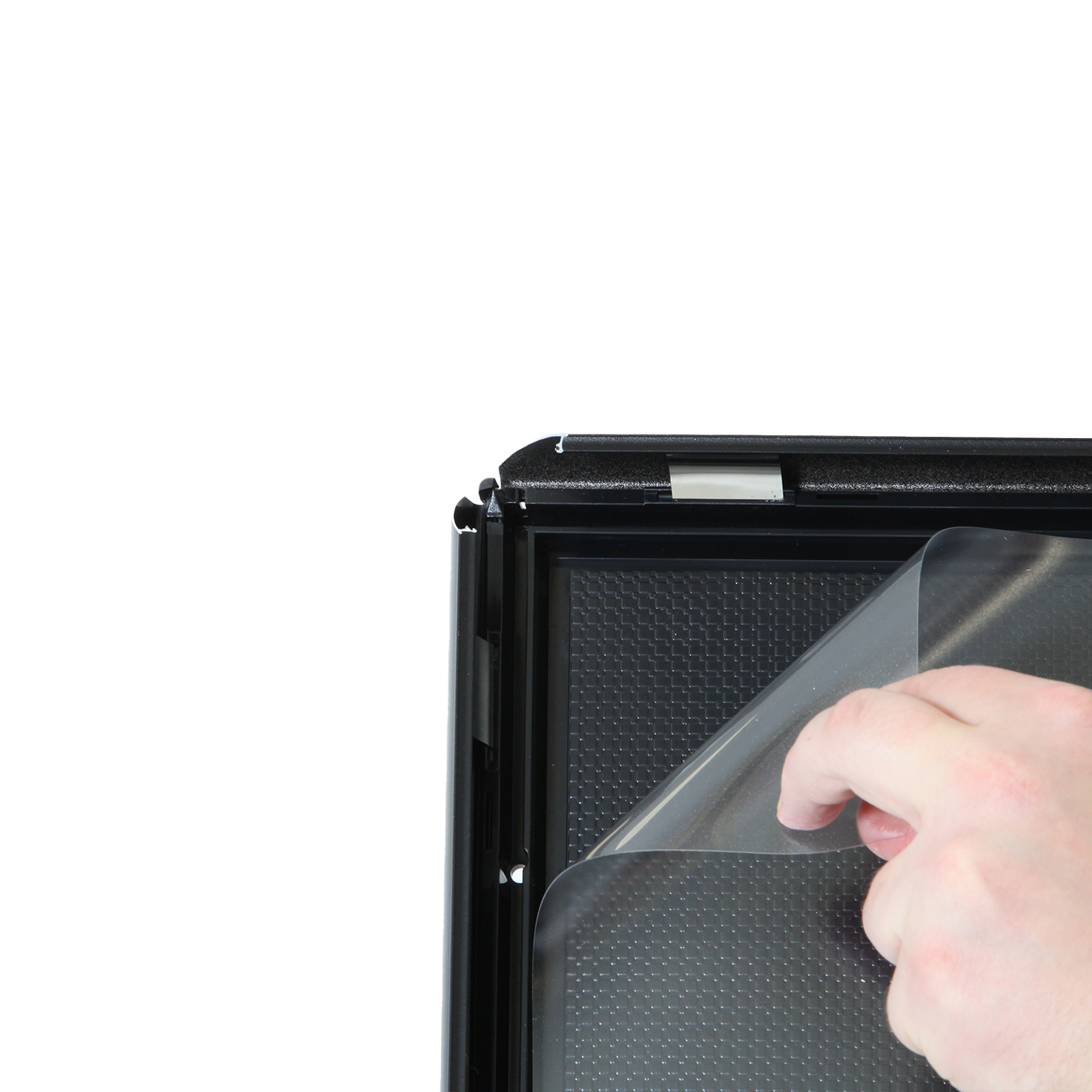 Montert med en sorteloksert klikkramme med 25 mm profil og APET-frontplate med antirefleks som gjør utskiftning av budskapet enkelt.
