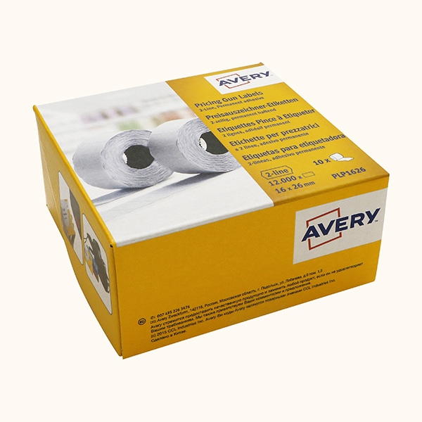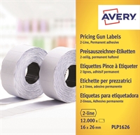 Pakke med 12.000 hvite permanentklebende etiketter på rulle, som passer til Avery prismerkepistol PL2/18(2 linje, 10+8 tegn, 16x26 mm).
