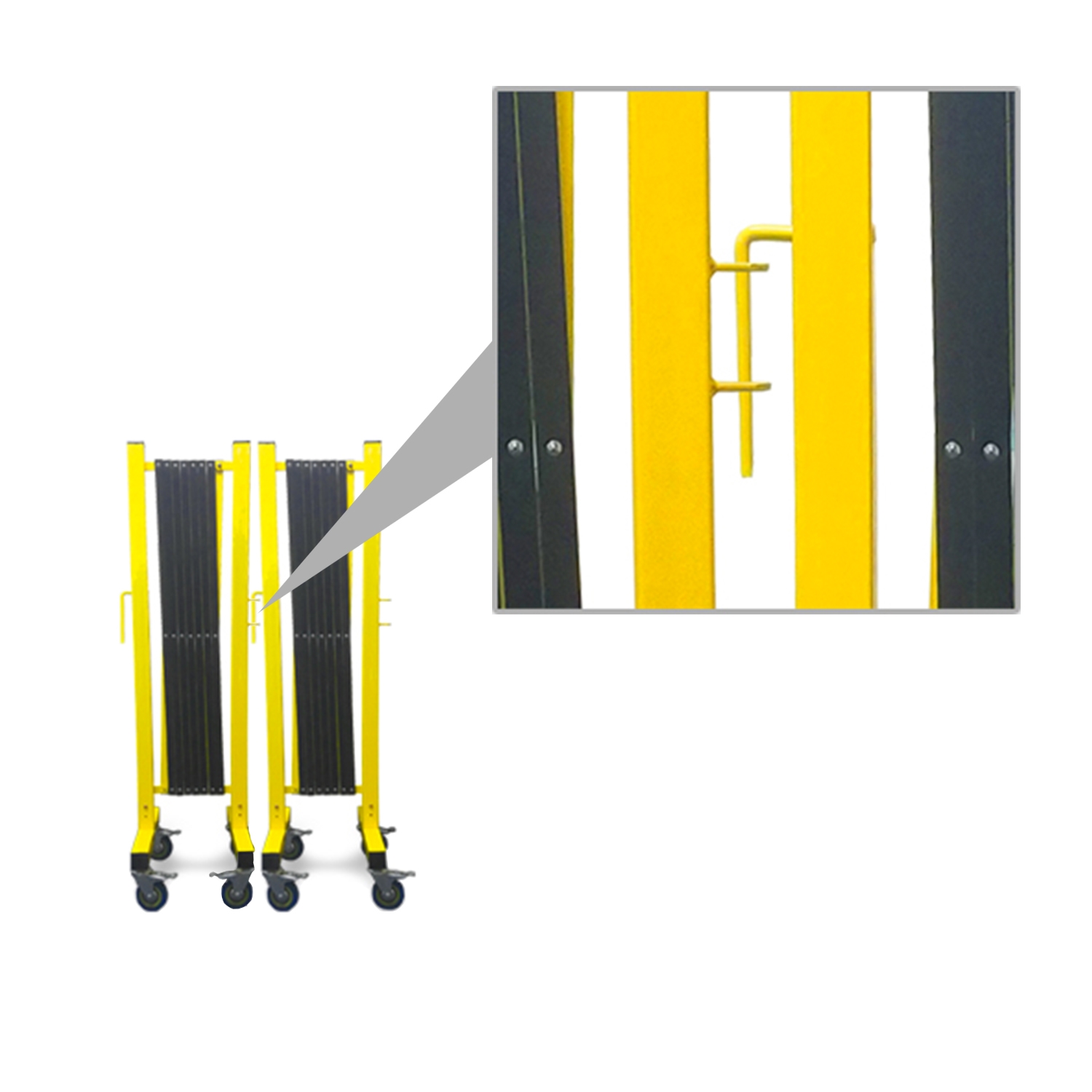 FlexFence kommer med innbyggede hjul for lettere transport, samt monteringskrok som gjør det mulig at sette en eller flere FlexFence sammen med hverandre og dermed utvide produktets bredde.