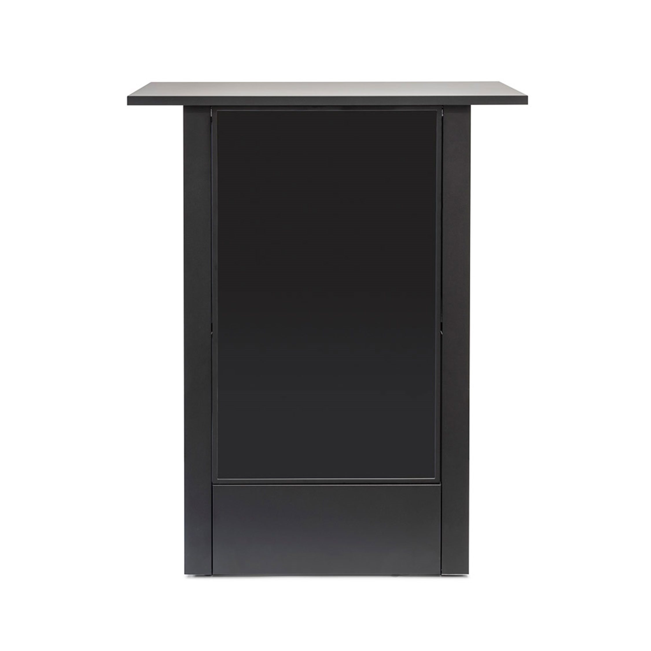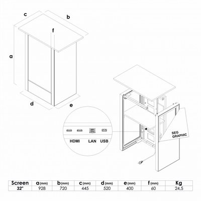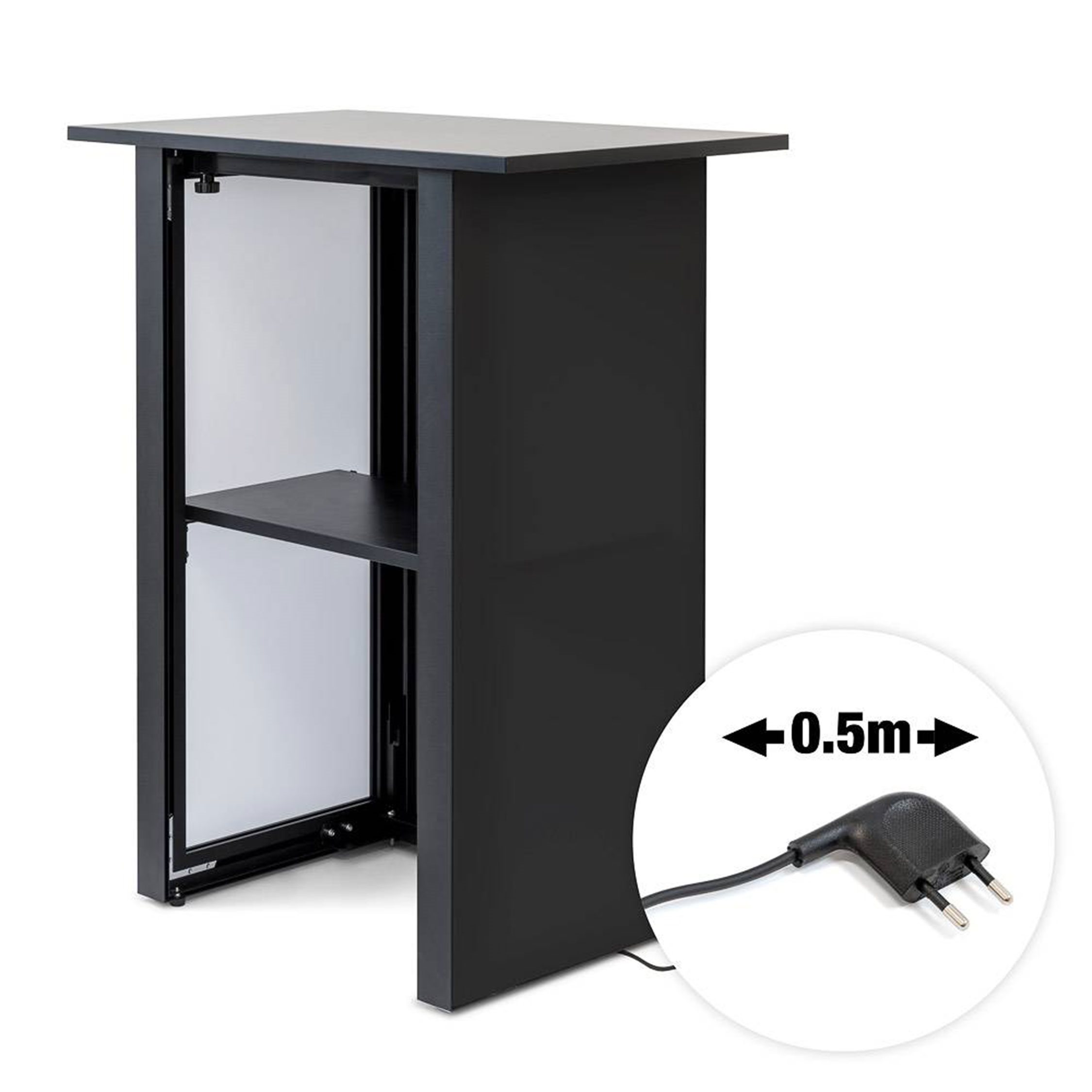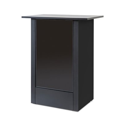 Premium og futuristisk: Det er hva den Digitale Futuro Messedisk handler om. På et øyeblikk har du satt opp bordet, takket være den verktøyfrie monteringen. Hyllen inni gir deg muligheten til å oppbevare messeutstyret ditt, så oppmerksomheten kun går til promoteringen på skjermen foran. Løft presentasjonen din til neste nivå og vis frem merkevaren, firmaet eller produktet ditt på messer, utstillinger, begivenheter, kjøpesentre, pop-up-butikker og mye mer!