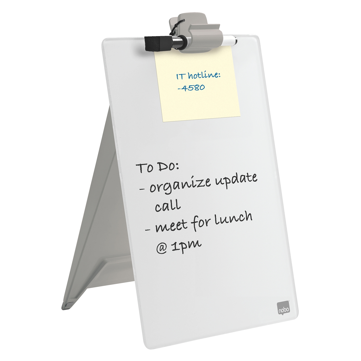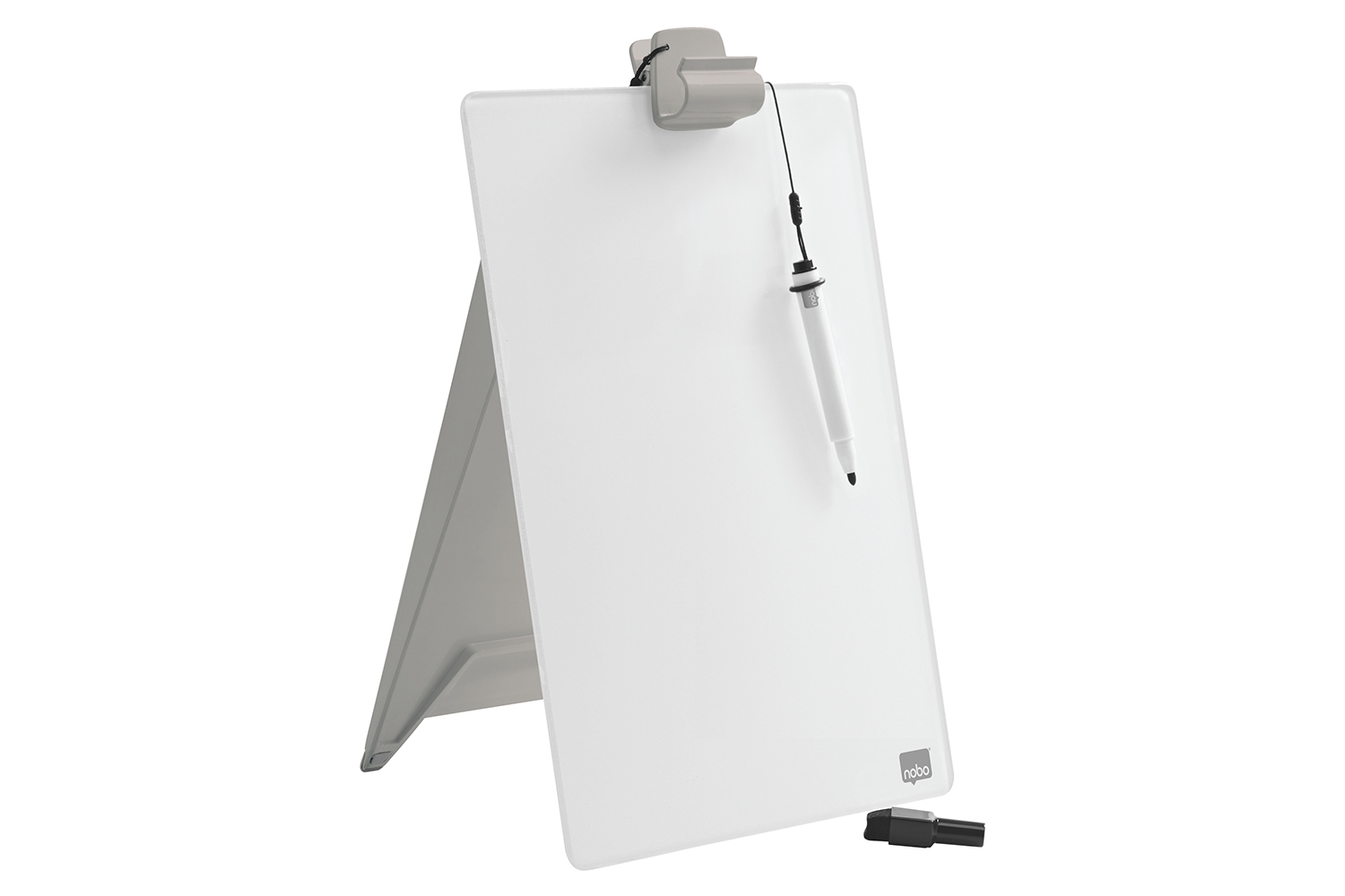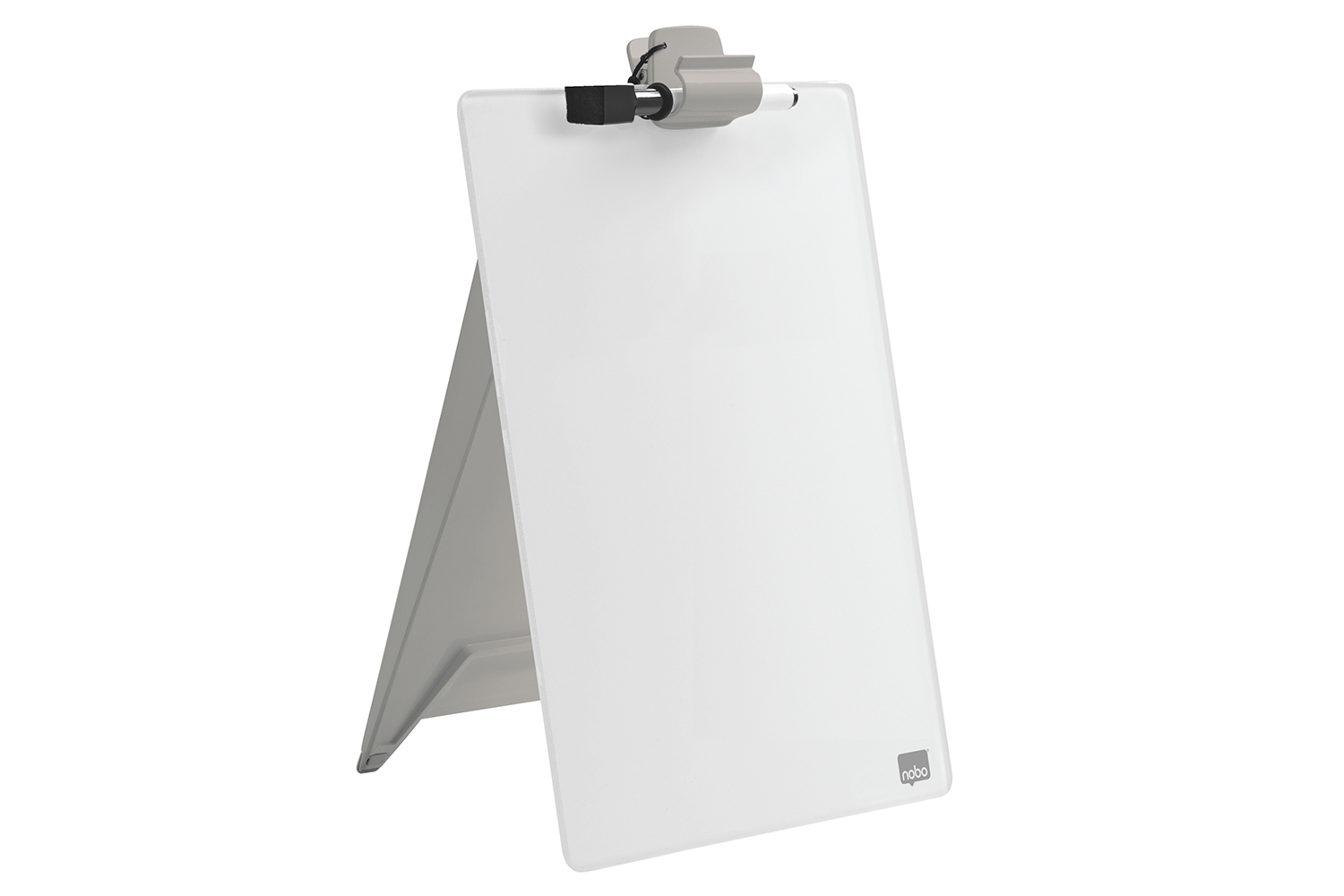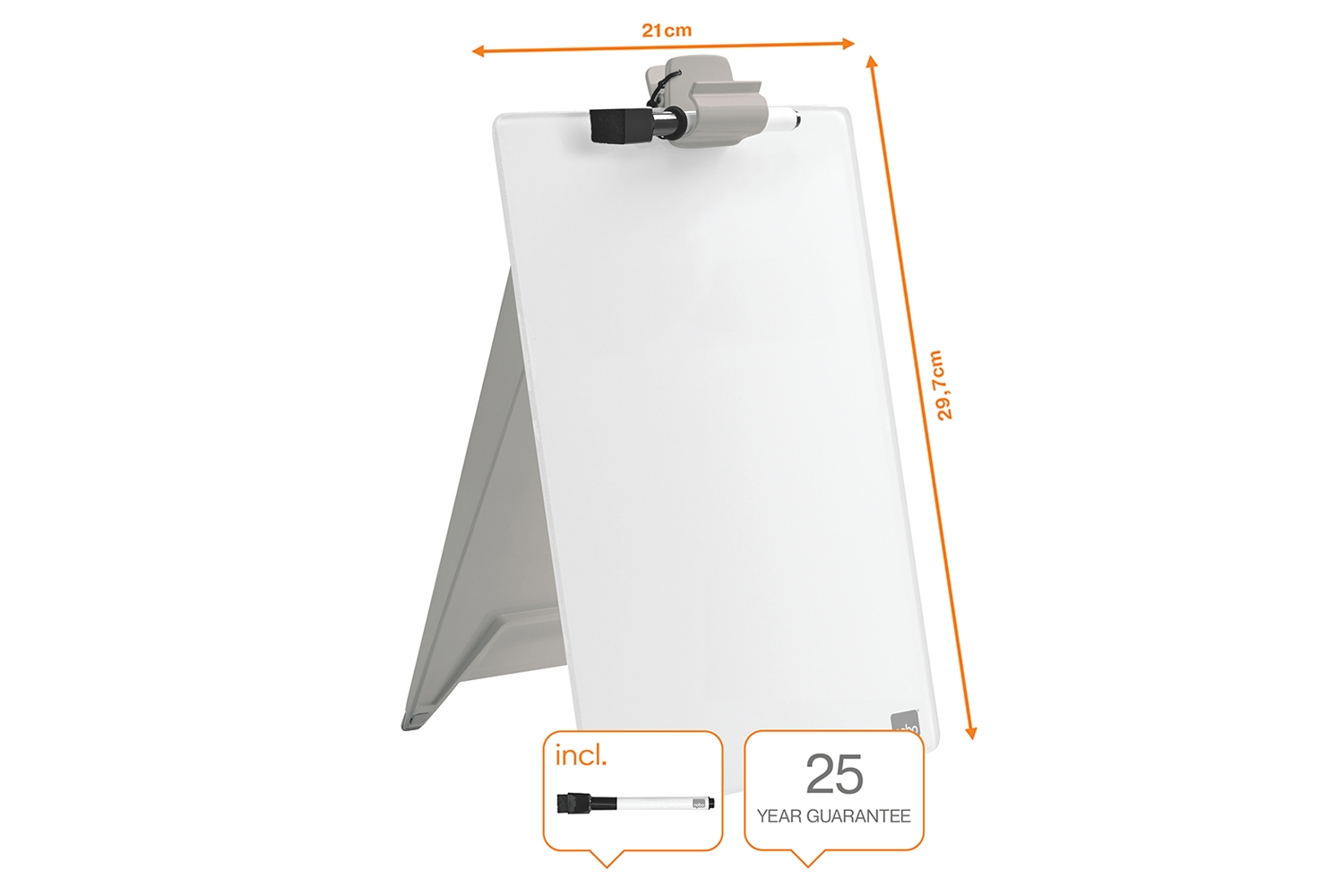 Bærbar A4 størrelses Glass Flipover Tavle. Stilfullt, rammeløst design med hvit premium glassoverflate. Det perfekte notat taging verktøy - Si farvel til post-it blokk overalt på skrivebordet etter notetagning, skriv, visk ut og skriv igen. Glassoverflaten er av høyeste kvalitet, og yter god motstand mot flekker og riper.