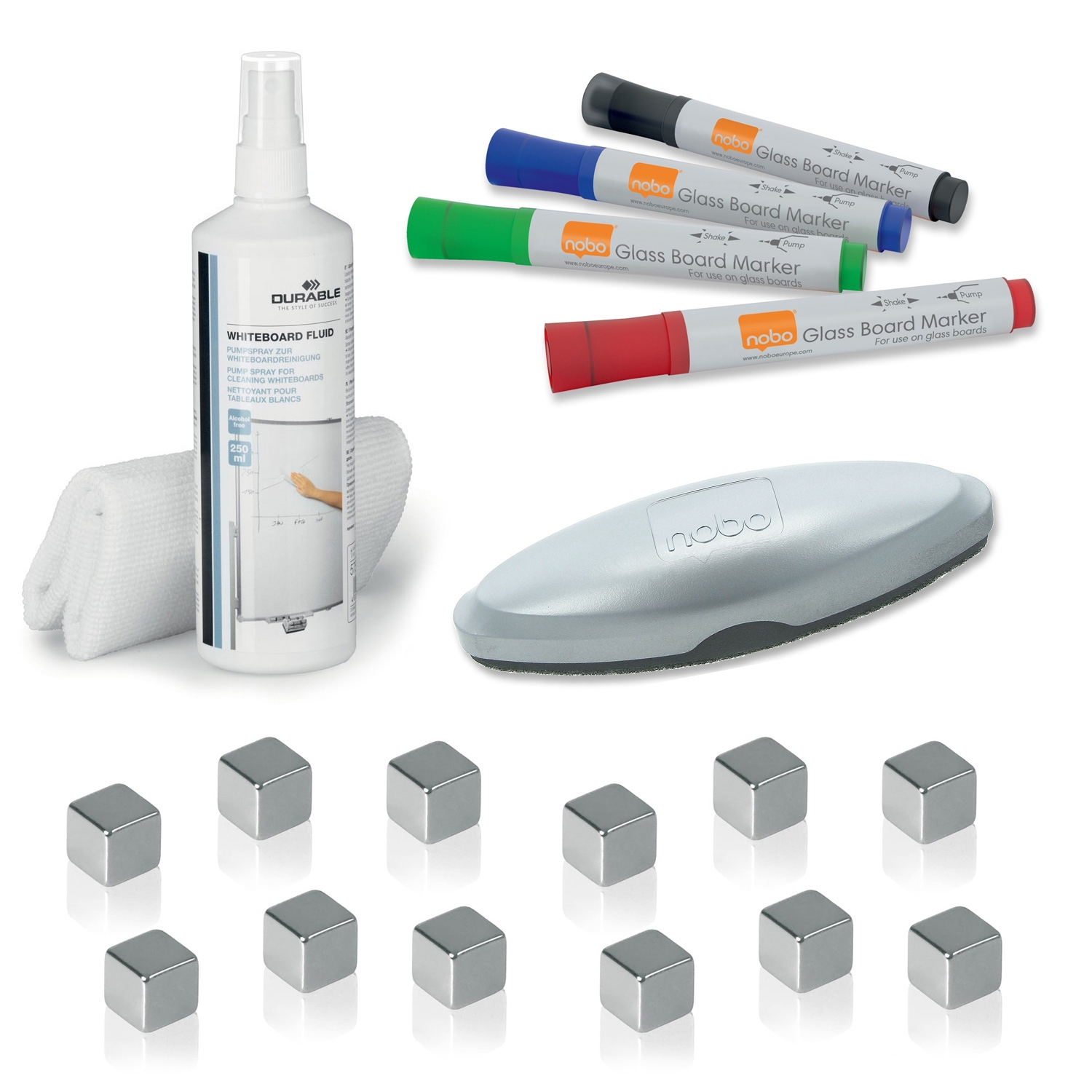 Glasstavle kit til lyse tavler med 12 ekstra sterk Superdym magneter, premium magnetisk tavlevisker, rensevæske og 4 stk glasstavle tusjer (Linjebredd 2,5 mm).