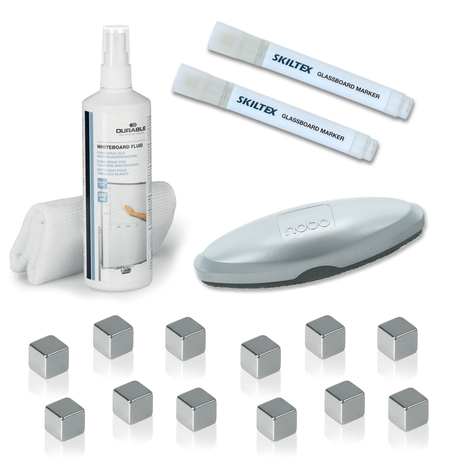 Glasstavle kit til mørke tavler (svart, rød, mm.) med 12 ekstra sterkr Superdym magneter, premium magnetisk tavlevisker, rensevæske og 2 stk hvite glasstavle tusjer (Linjebredd 2,5 mm).