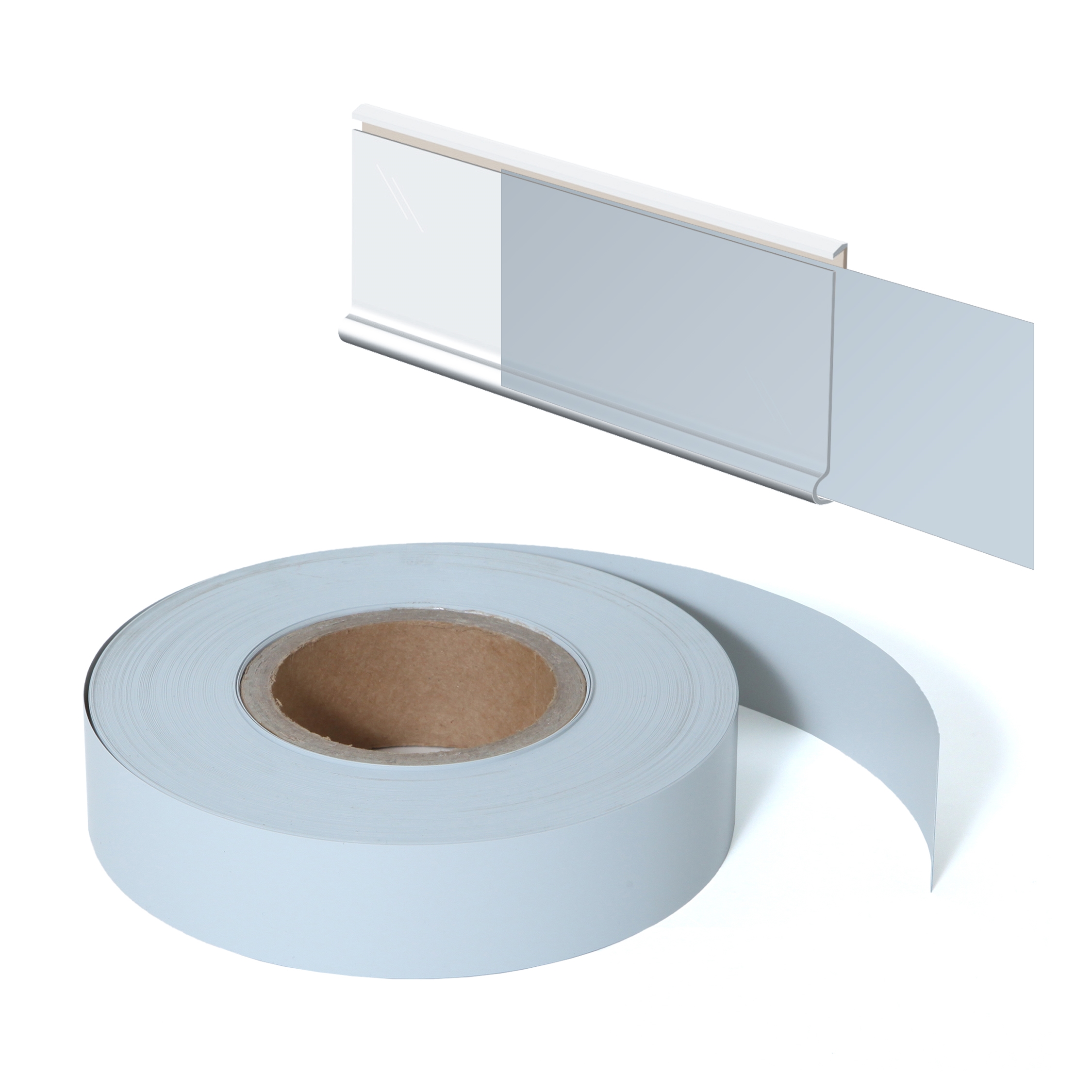 Rullen er 39 mm i høyden, og 100 meter i lengden, laget av grå plastik som er lett at klippe til, og sette i siden på hylleforkanter.