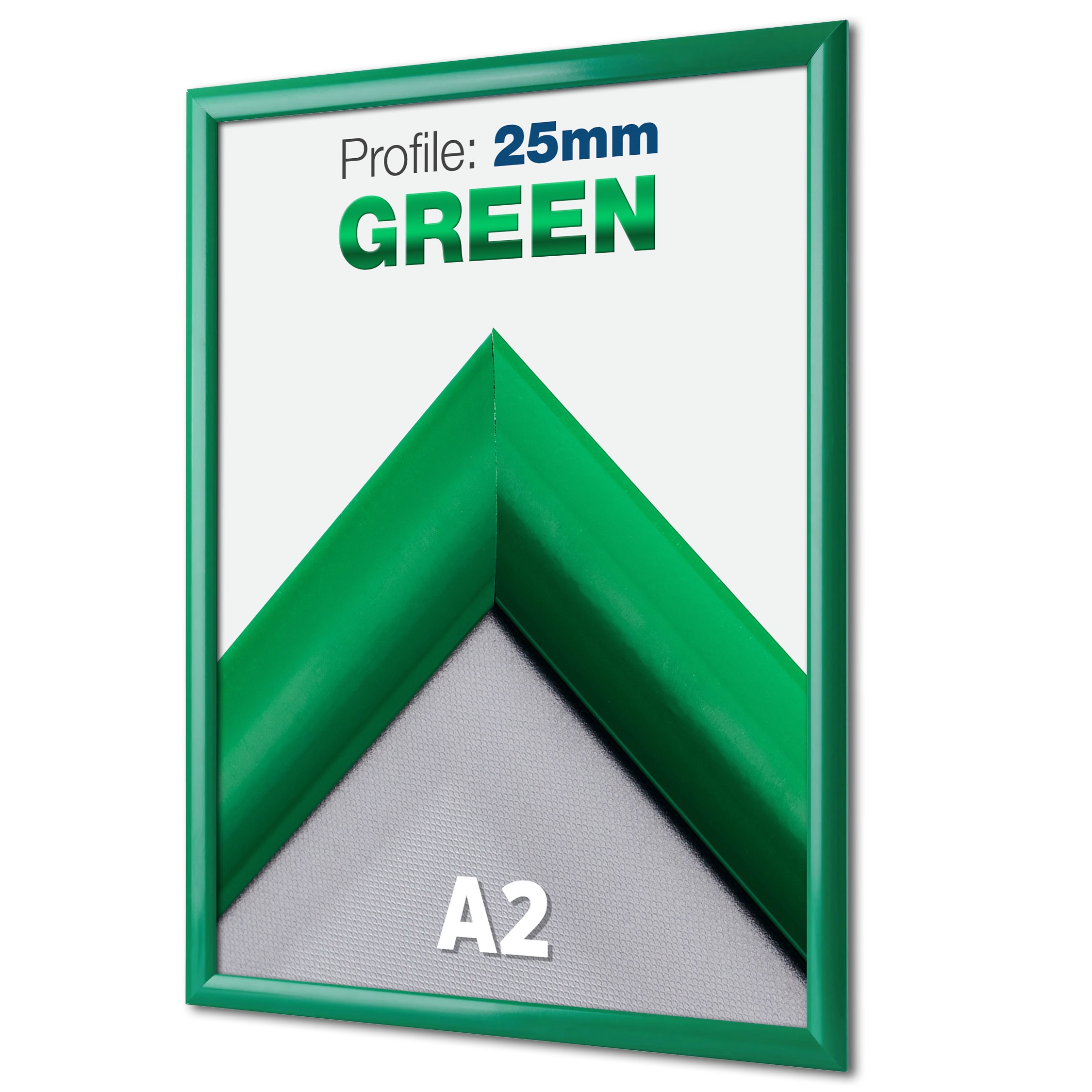 A2 klikkramme med 25 mm profil i grønn farge - ideell for presentasjon og utskifting av plakater, advarselsskilt eller informasjon. Den tiltrekker oppmerksomhet med sin synlige og klare farge!