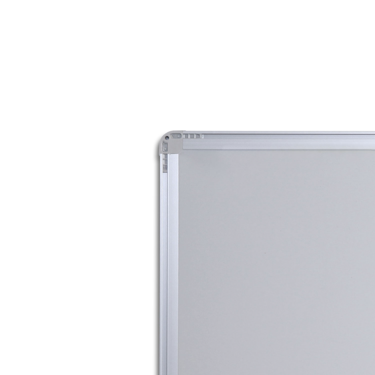 Klassisk magnetisk tavle med bakplate i grønnlakkert stål og aluminiumsramme med grå plasthjørner.