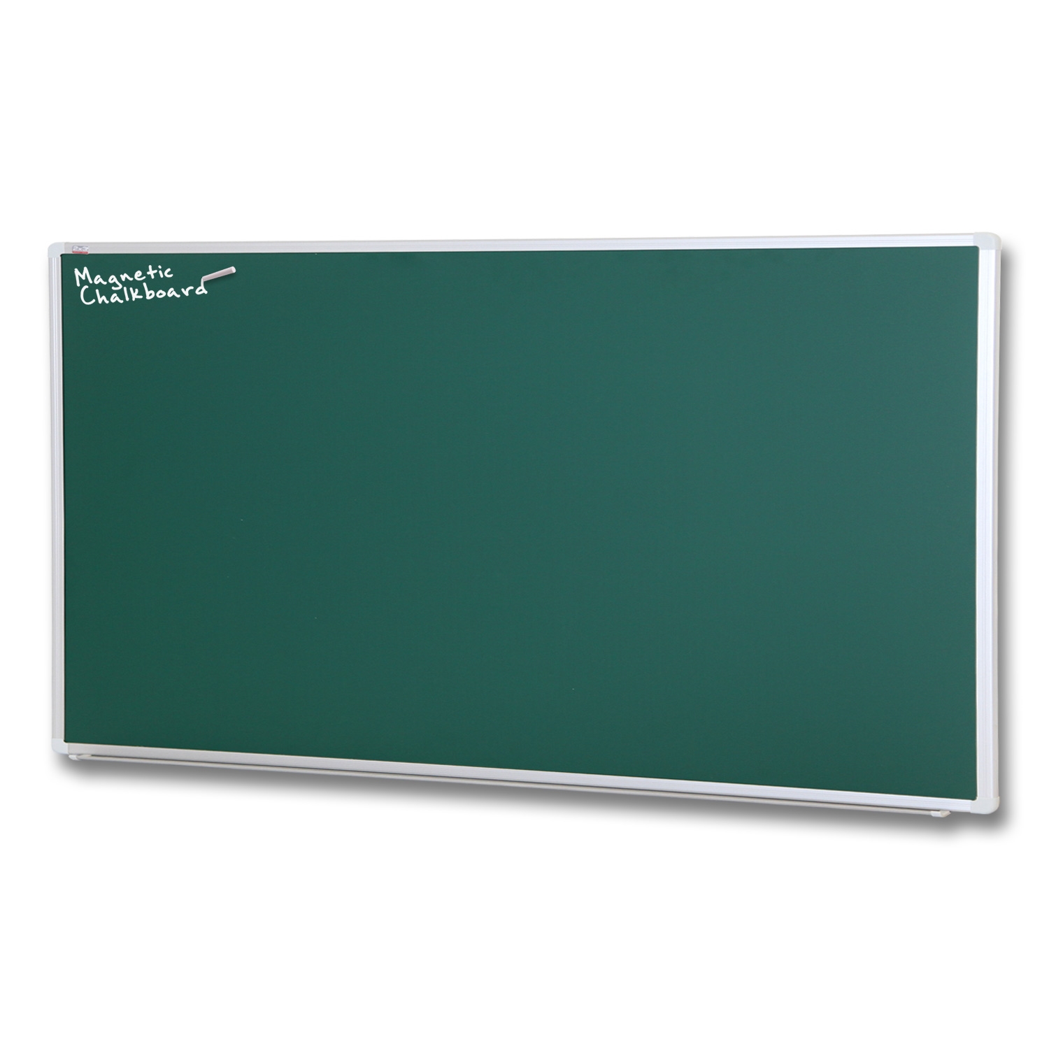 Klassisk magnetisk tavle med bakplate i grønnlakkert stål og aluminiumsramme med grå plasthjørner.