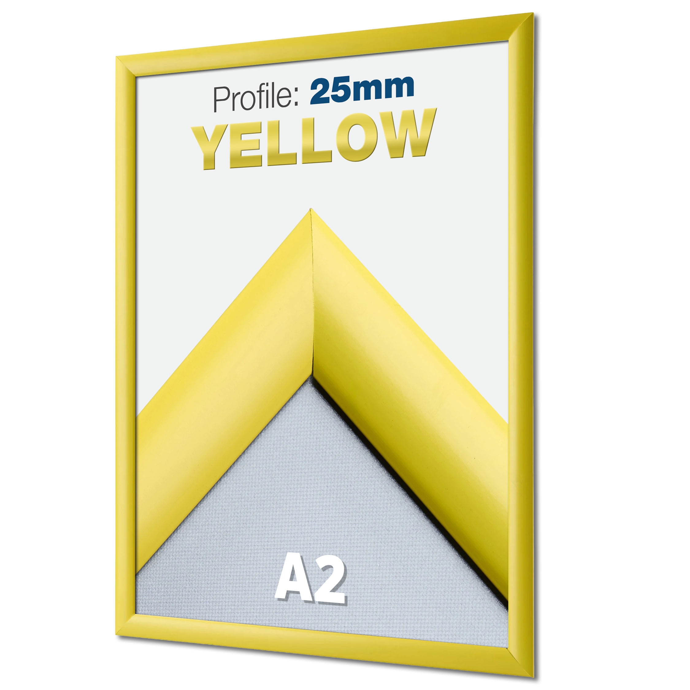 A2 klikkramme med 25 mm profil i kraftig gul - perfekt for presentasjon og enkel utskifting av plakater, varselskilt eller informasjon. Den sterke fargen tiltrekker stor oppmerksomhet!