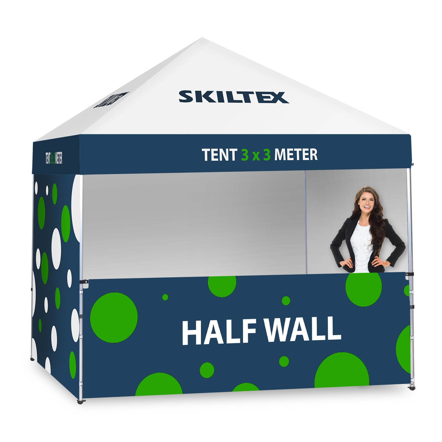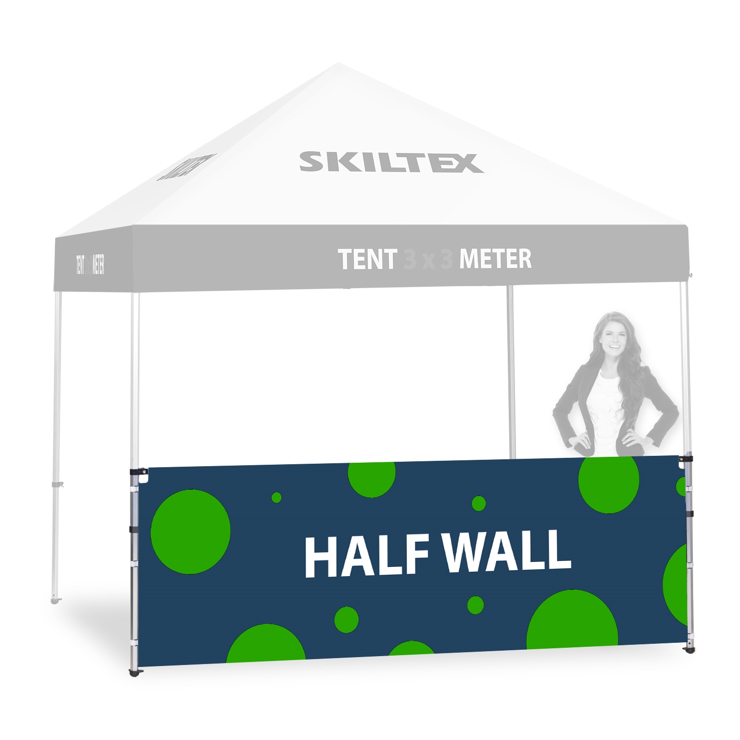 Halvvegg kit består av et fullfarget halvvegg banner med ditt eget trykk og en halvvegg støttestang som gjør at halvvegg banneret kan monteres på ditt SKILTEX 3x3 reklametelt.