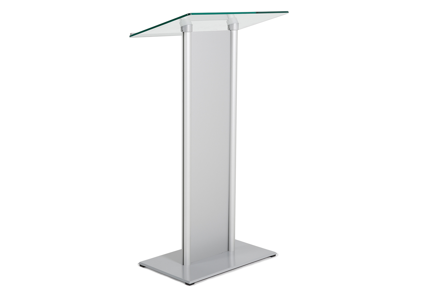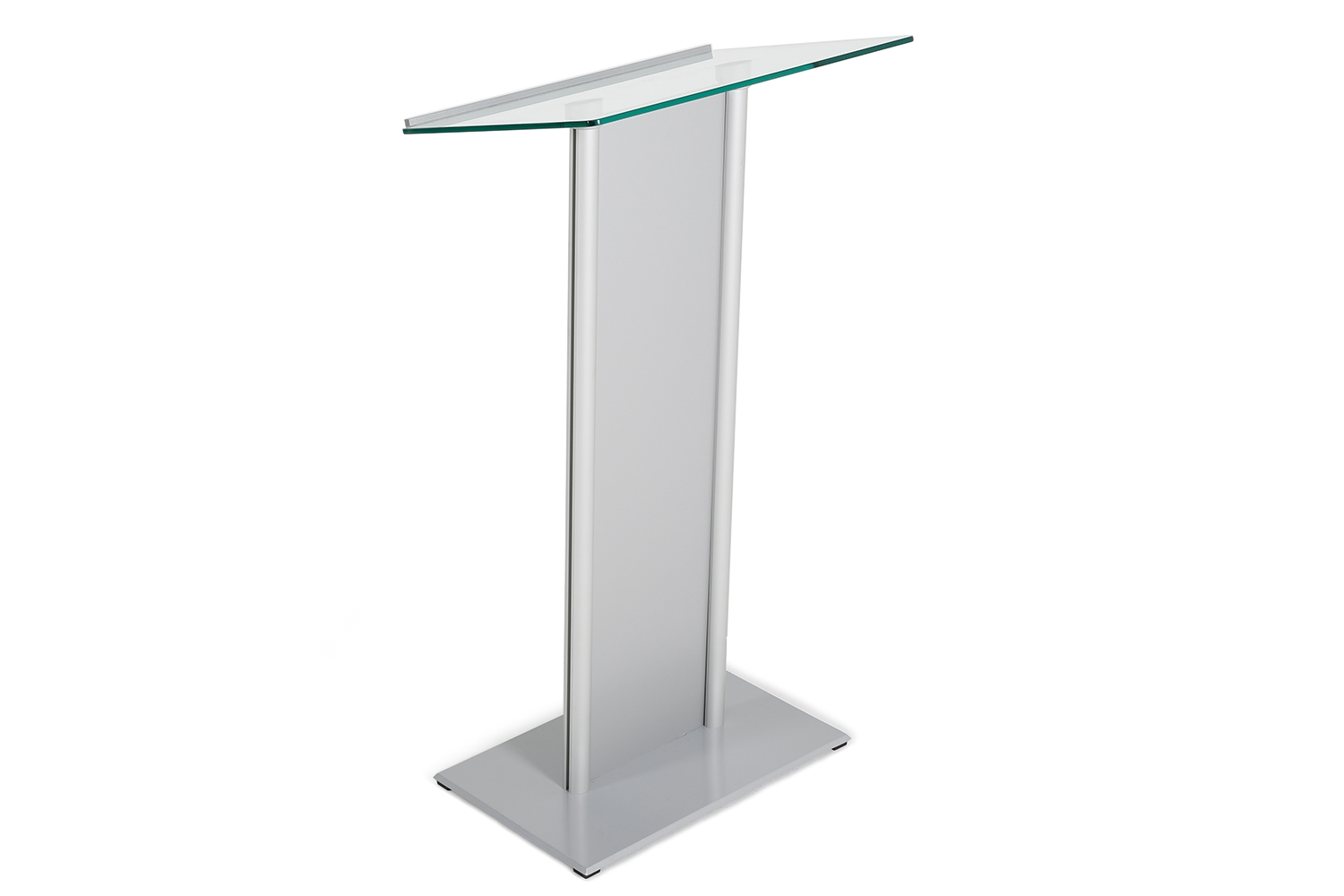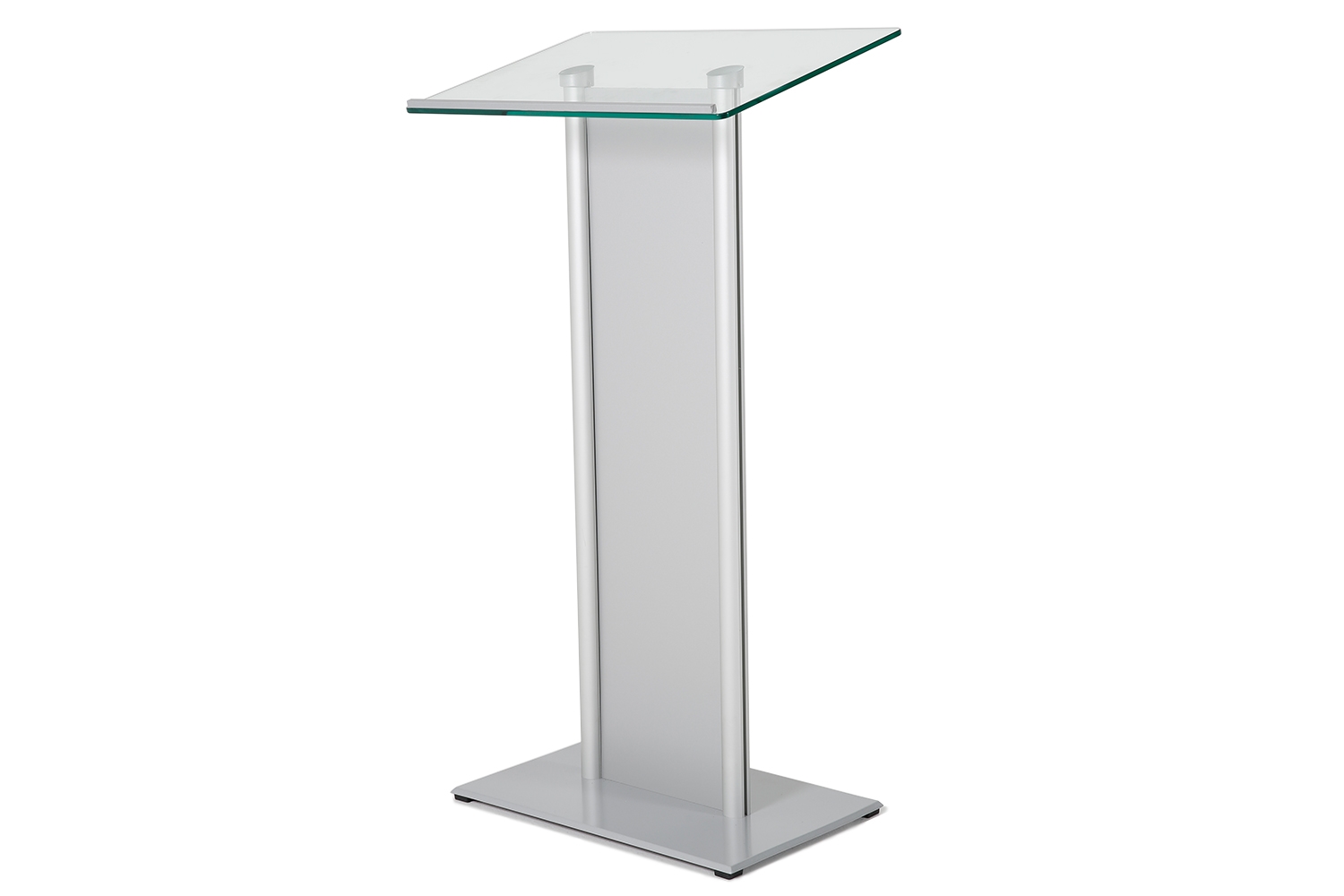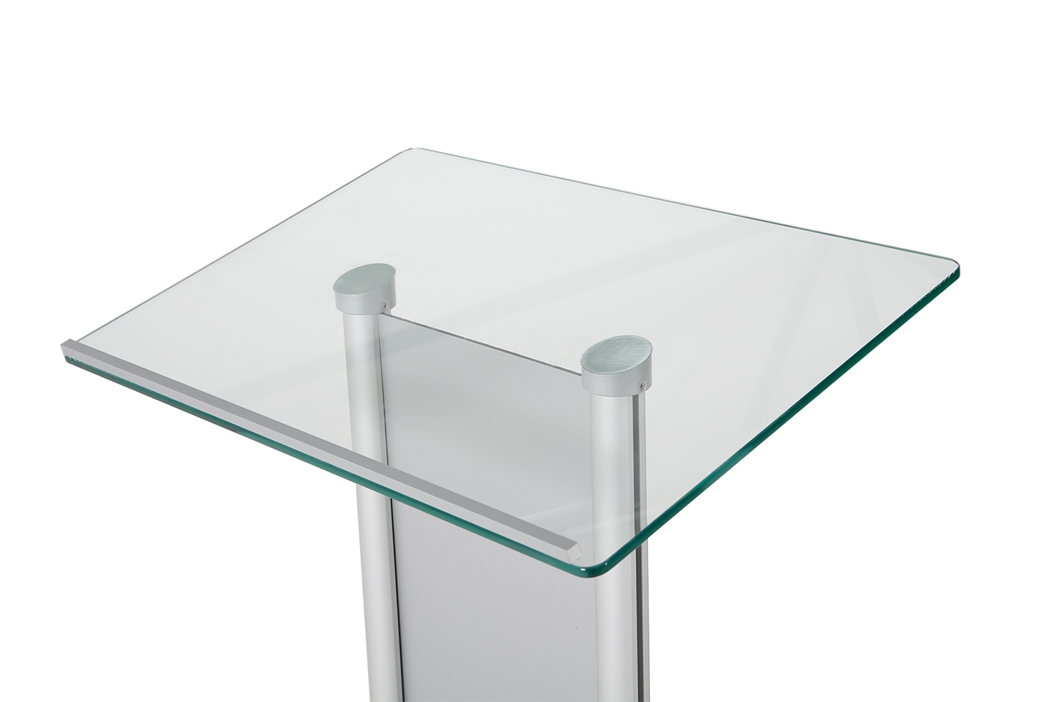 Et modernt podium med herdet glassoverflate, sølvfarget aluminiums frontpanel, samt metall stenger og fot som sørger for at podiummet står godt fast. Glasoverflaten har en dokumentholder i bunnen som sørger for at talerens papir er klare til presentasjon.