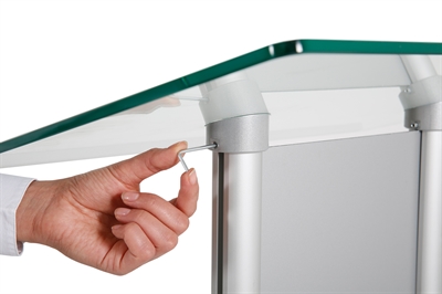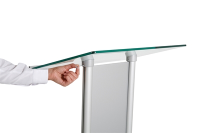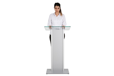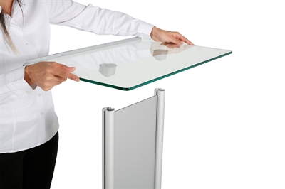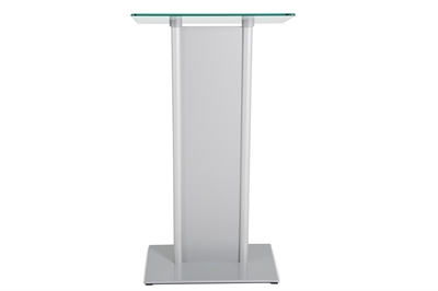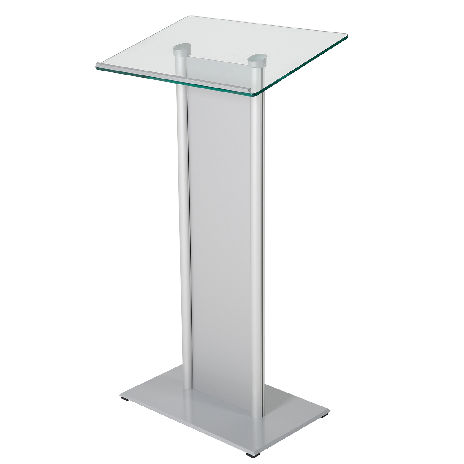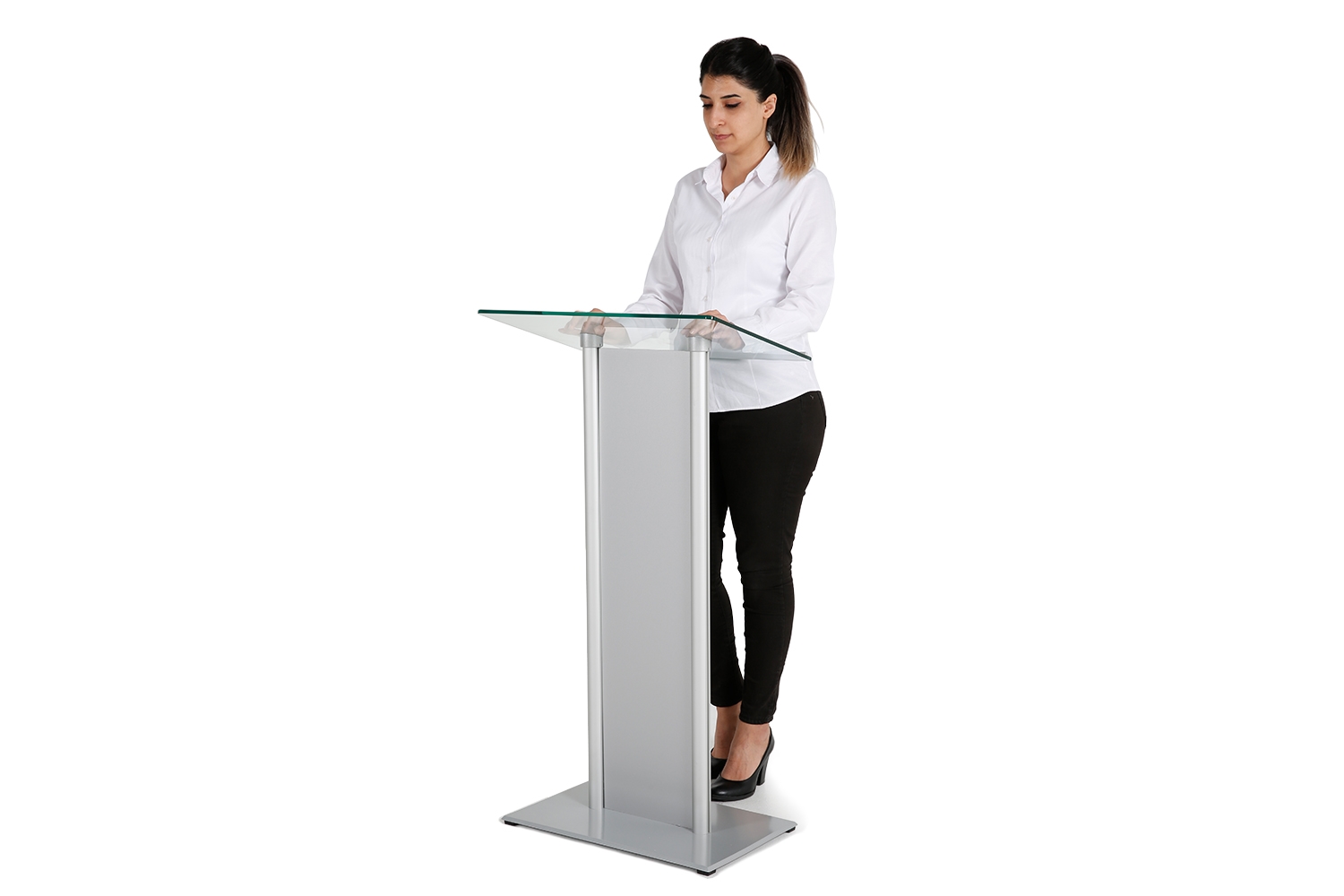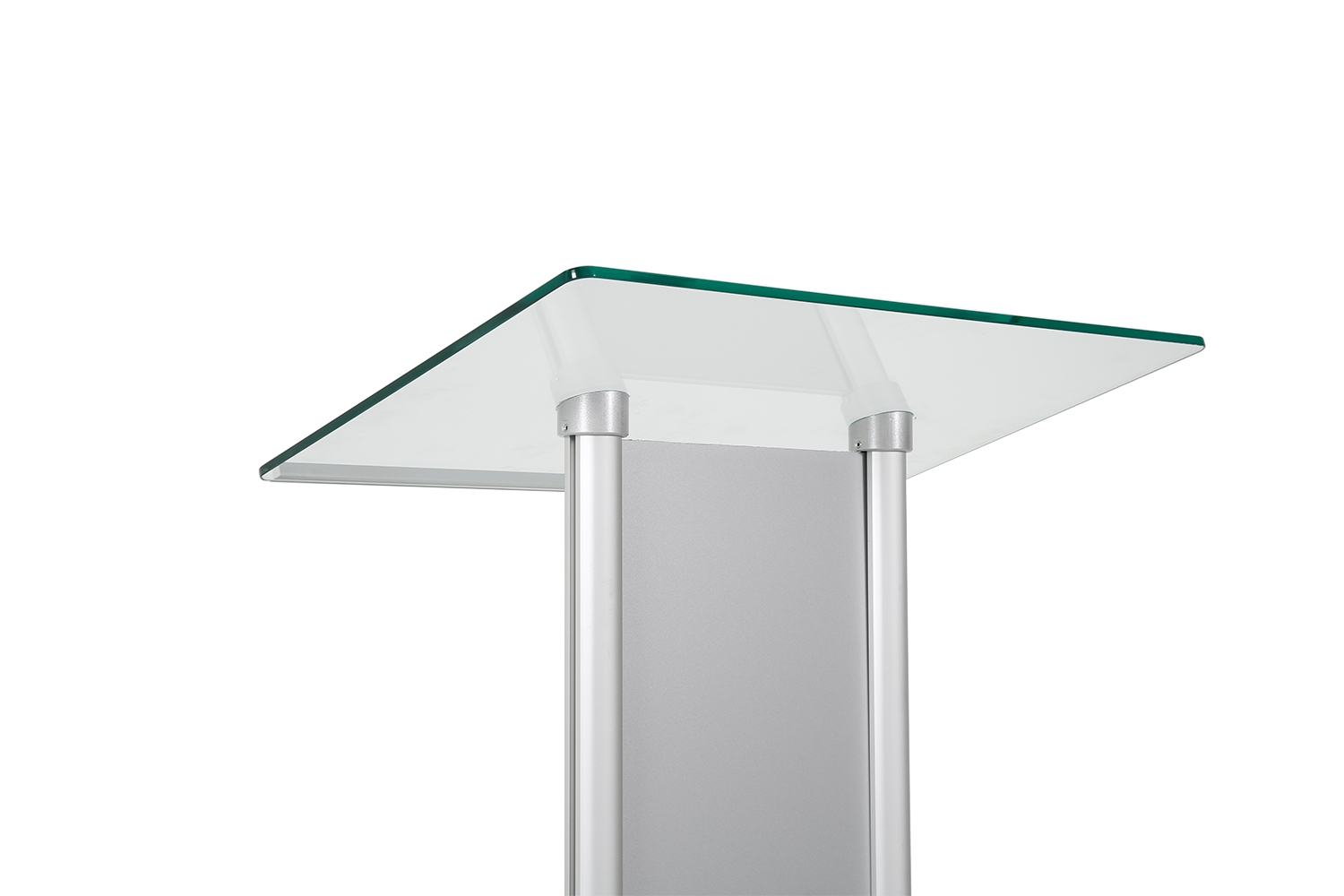 Et modernt podium med herdet glassoverflate, sølvfarget aluminiums frontpanel, samt metall stenger og fot som sørger for at podiummet står godt fast. Glasoverflaten har en dokumentholder i bunnen som sørger for at talerens papir er klare til presentasjon.