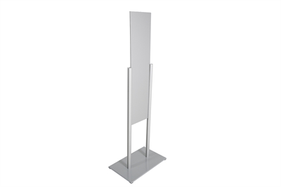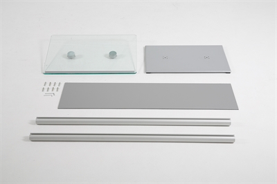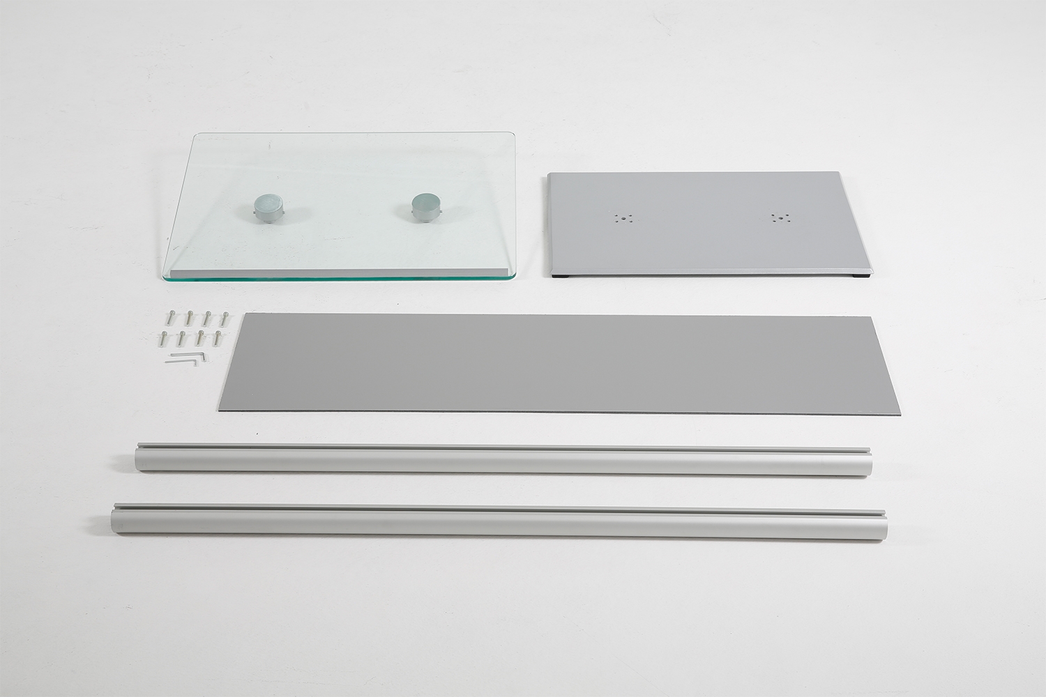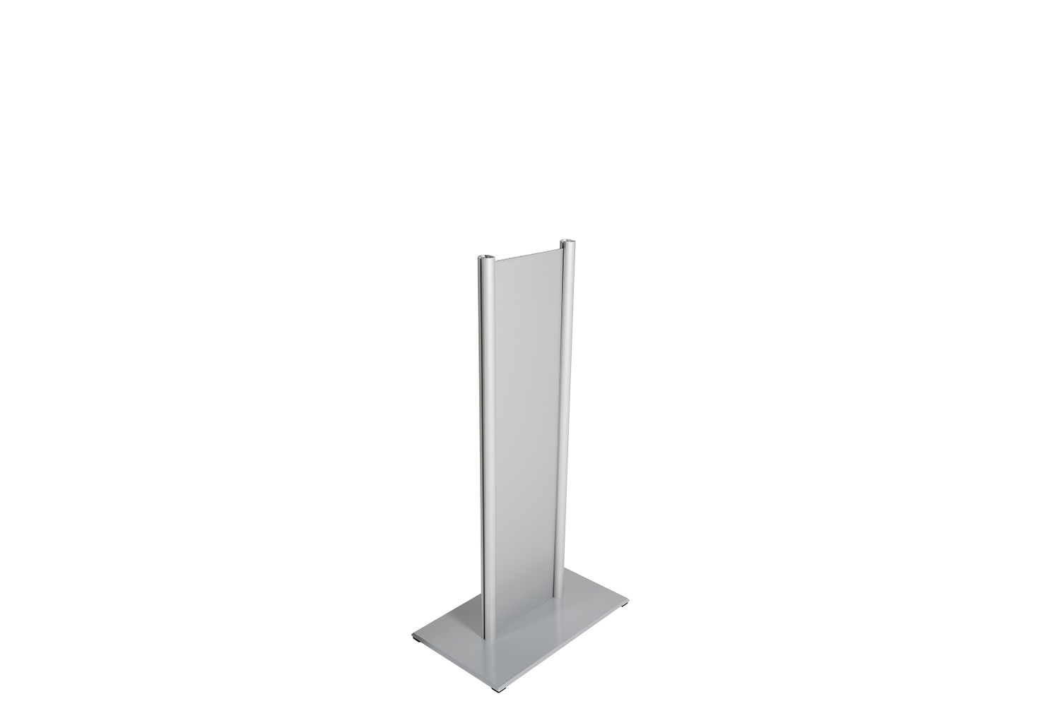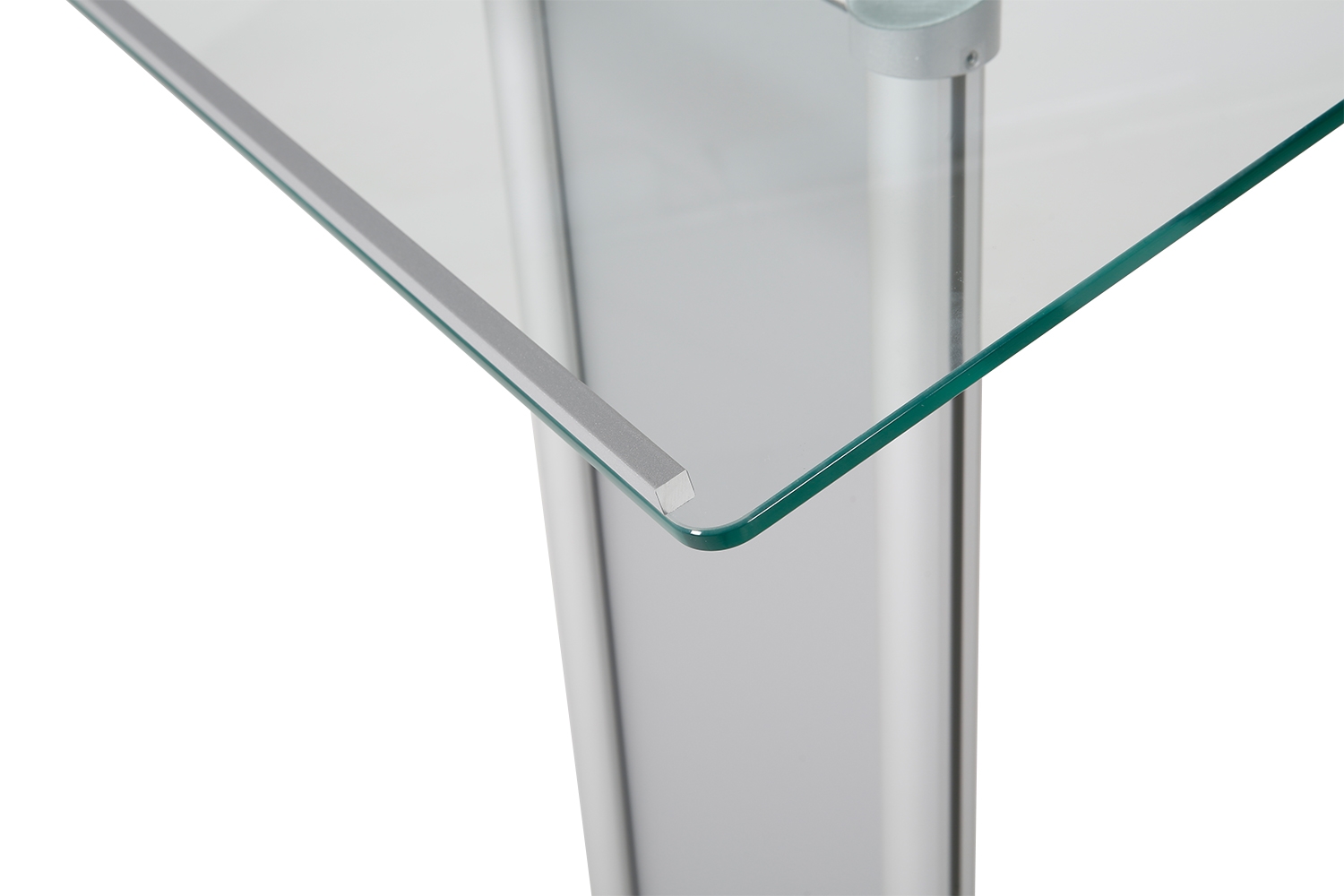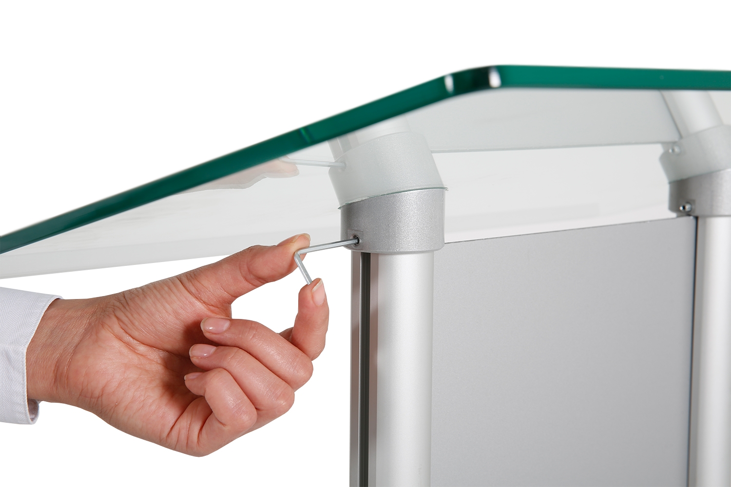 Et modernt podium med herdet glassoverflate, sølvfarget aluminiums frontpanel, samt metall stenger og fot som sørger for at podiummet står godt fast. Glasoverflaten har en dokumentholder i bunnen som sørger for at talerens papir er klare til presentasjon.