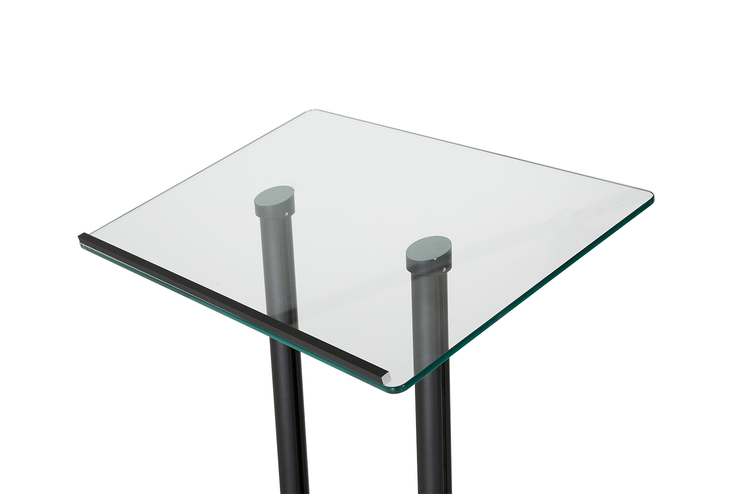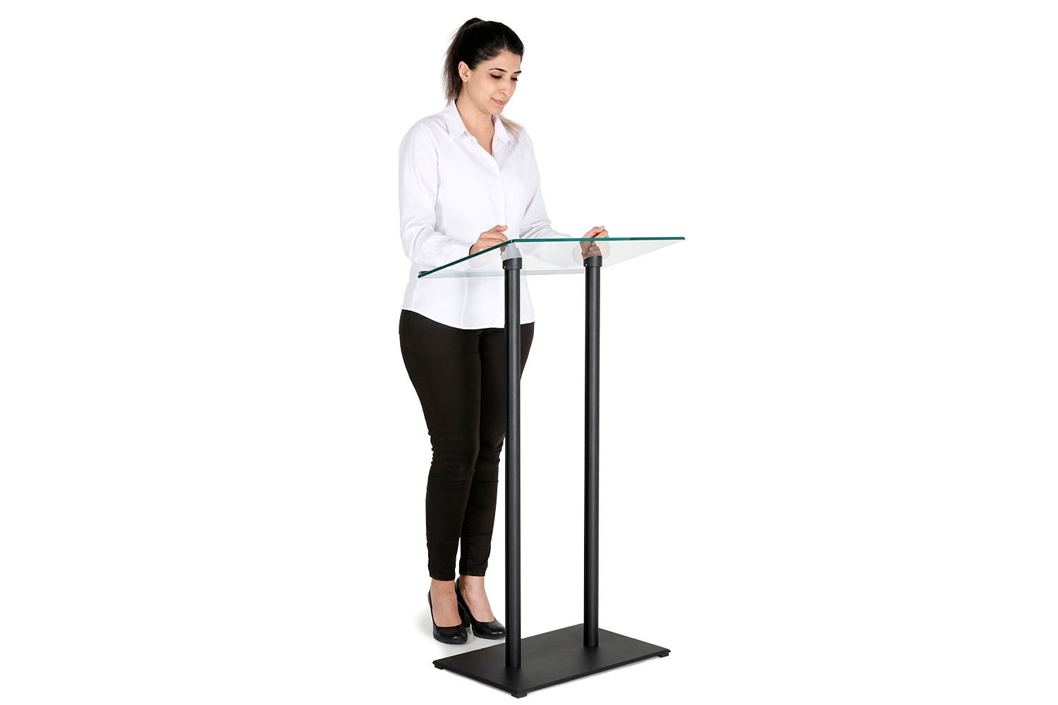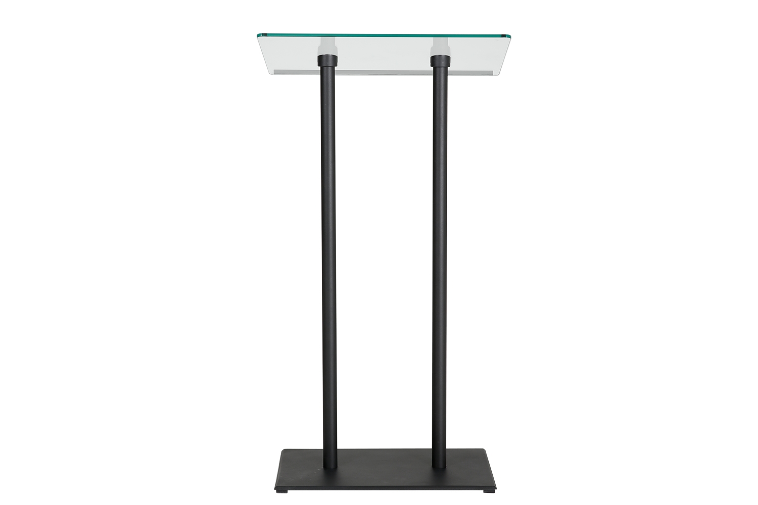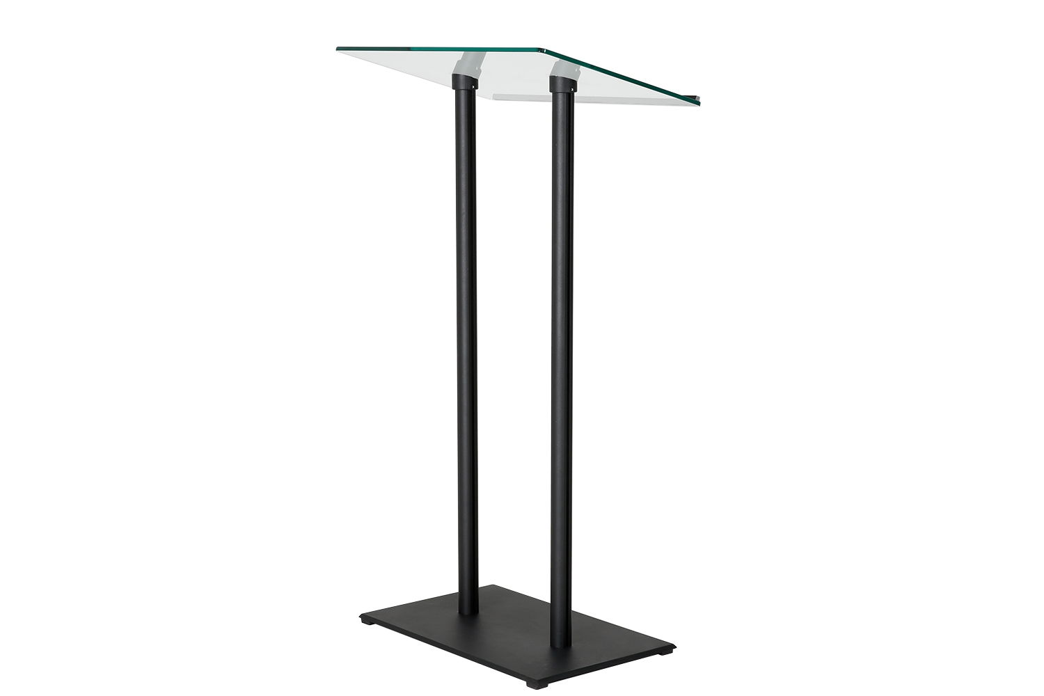 En modern talerstol med herdet glassoverflate, svarte metallstenger og fot som sørger for at podiummet står godt fast. Glassoverflaten har en dokumentholder i bunnen som sørger for at talerens papir er klare til presentasjon.