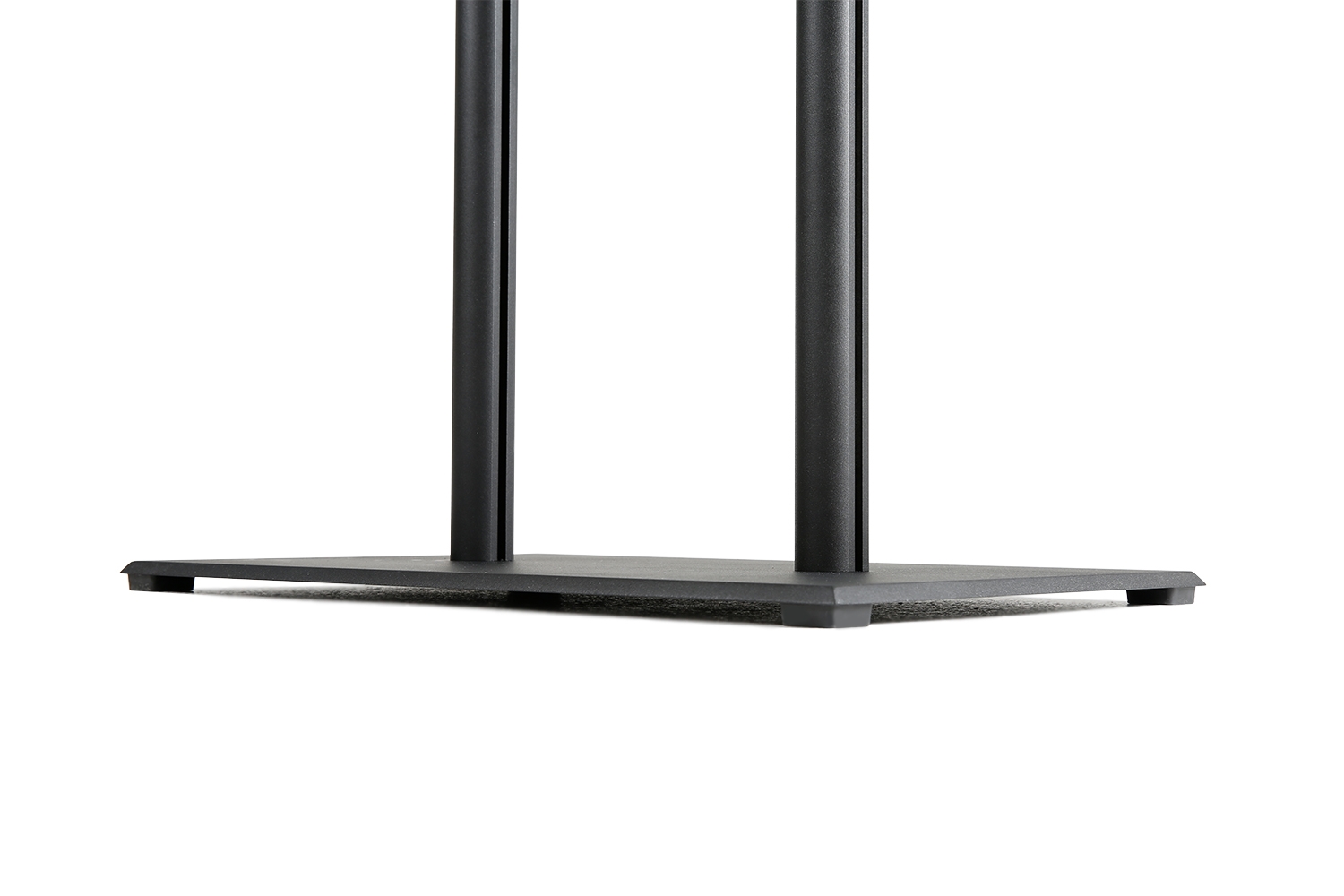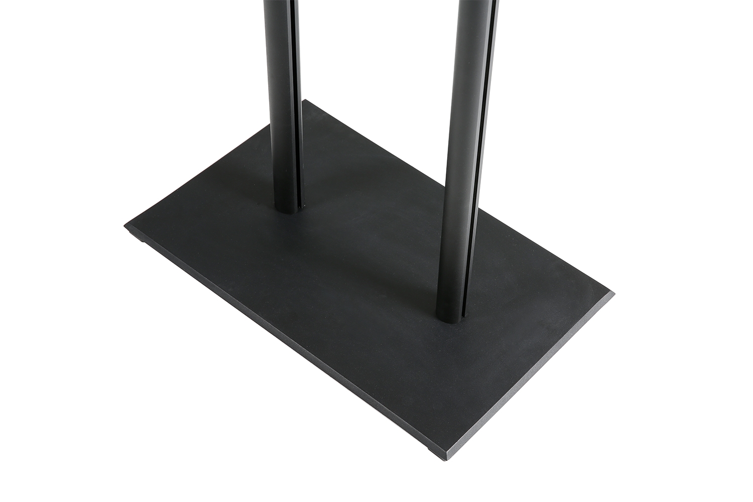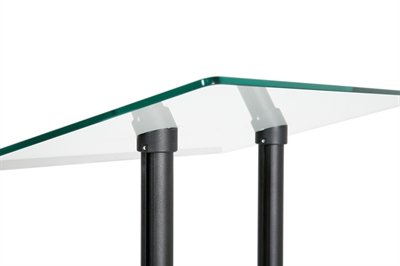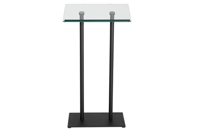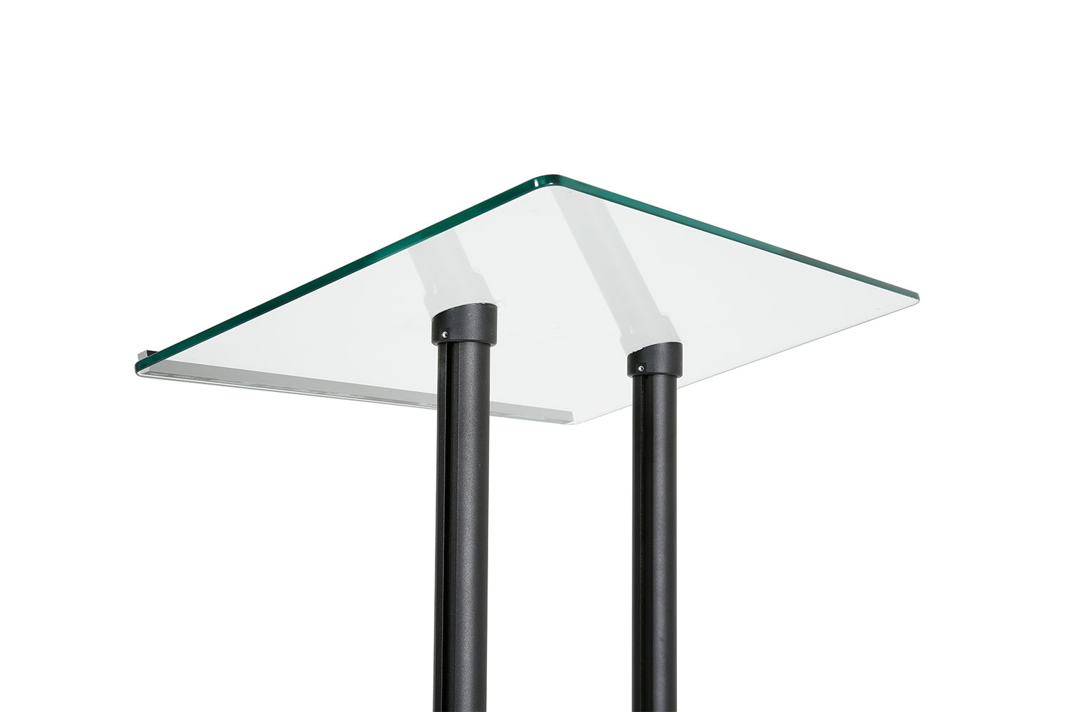 En modern talerstol med herdet glassoverflate, svarte metallstenger og fot som sørger for at podiummet står godt fast. Glassoverflaten har en dokumentholder i bunnen som sørger for at talerens papir er klare til presentasjon.