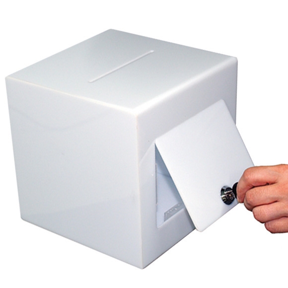 Forslagskasse i hvit akryl med låsbar dør (inkl. nøkler) 12,5cm spor i toppen lar deg sette inn stemmesedler, ris og ros, konkurransekuponger, penger mm. i boksen.