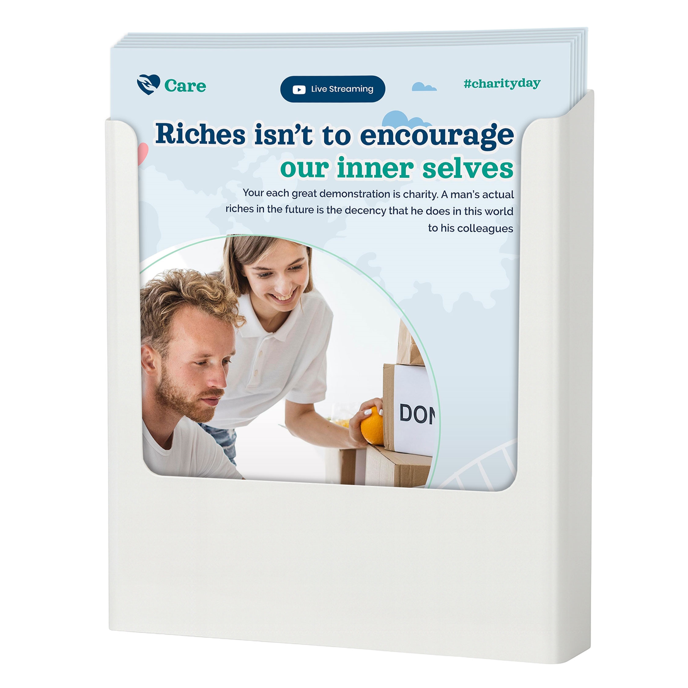 Stilrent hvitt brosjyreholder produsert i polystyren til montering på vegg.
