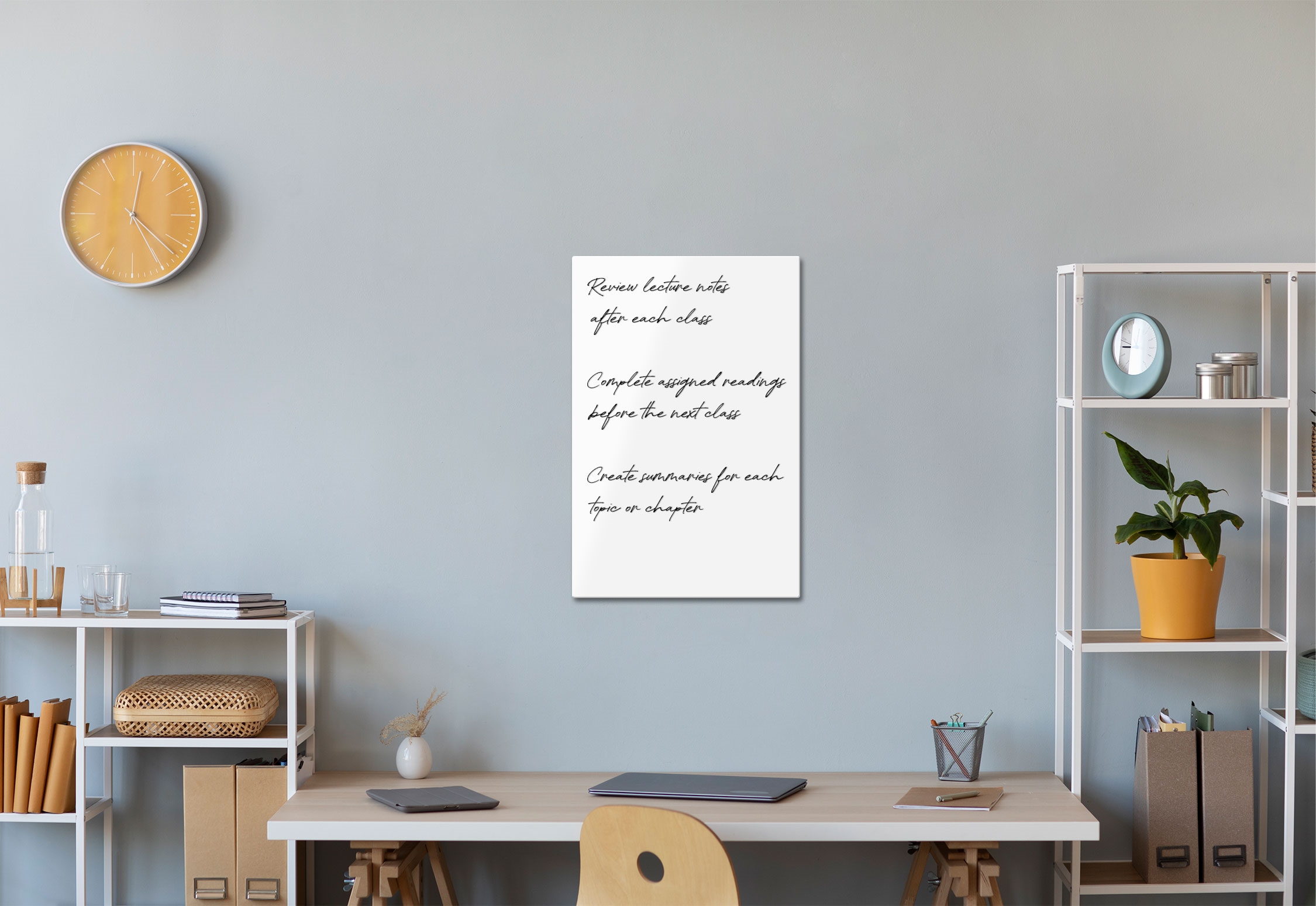 Stilren hvit glasstavle laget av herdet glass med magnetisk overflate, for sikker bruk hjemme eller på kontoret. Tavlens tettsittende og diskrete design sørger for at den sitter helt inntil veggen.