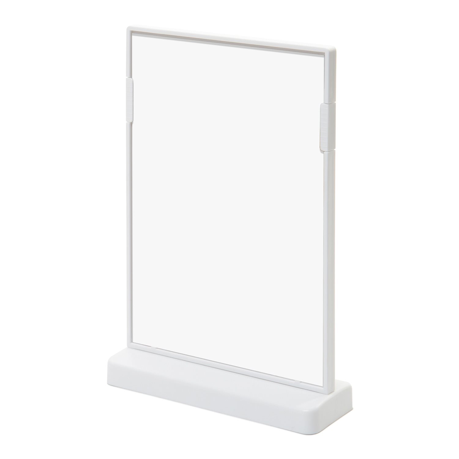 Hvit dobbeltsidig T-stativ menyholder i stående format med smart klipssystem, laget av hvit, slitesterk polypropylenplast. Garantert stabilitet med slitesterk base. Dobbeltsidig presentasjon for å sette inn og enkelt bytte A5- og A6-ark.