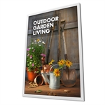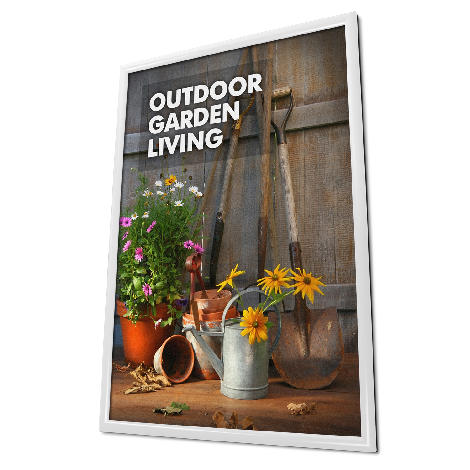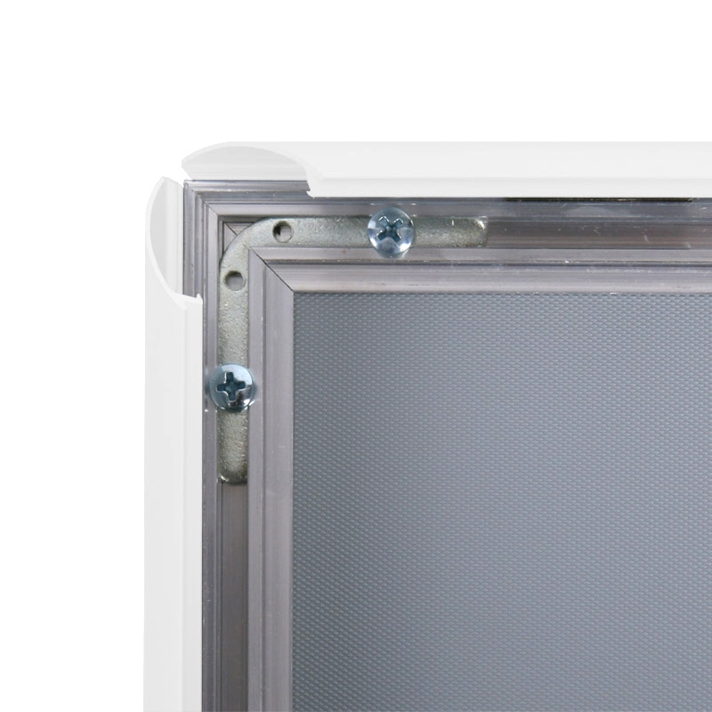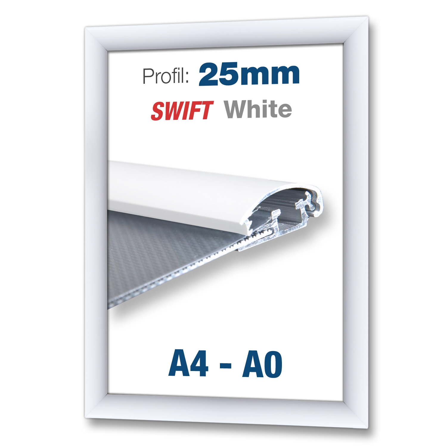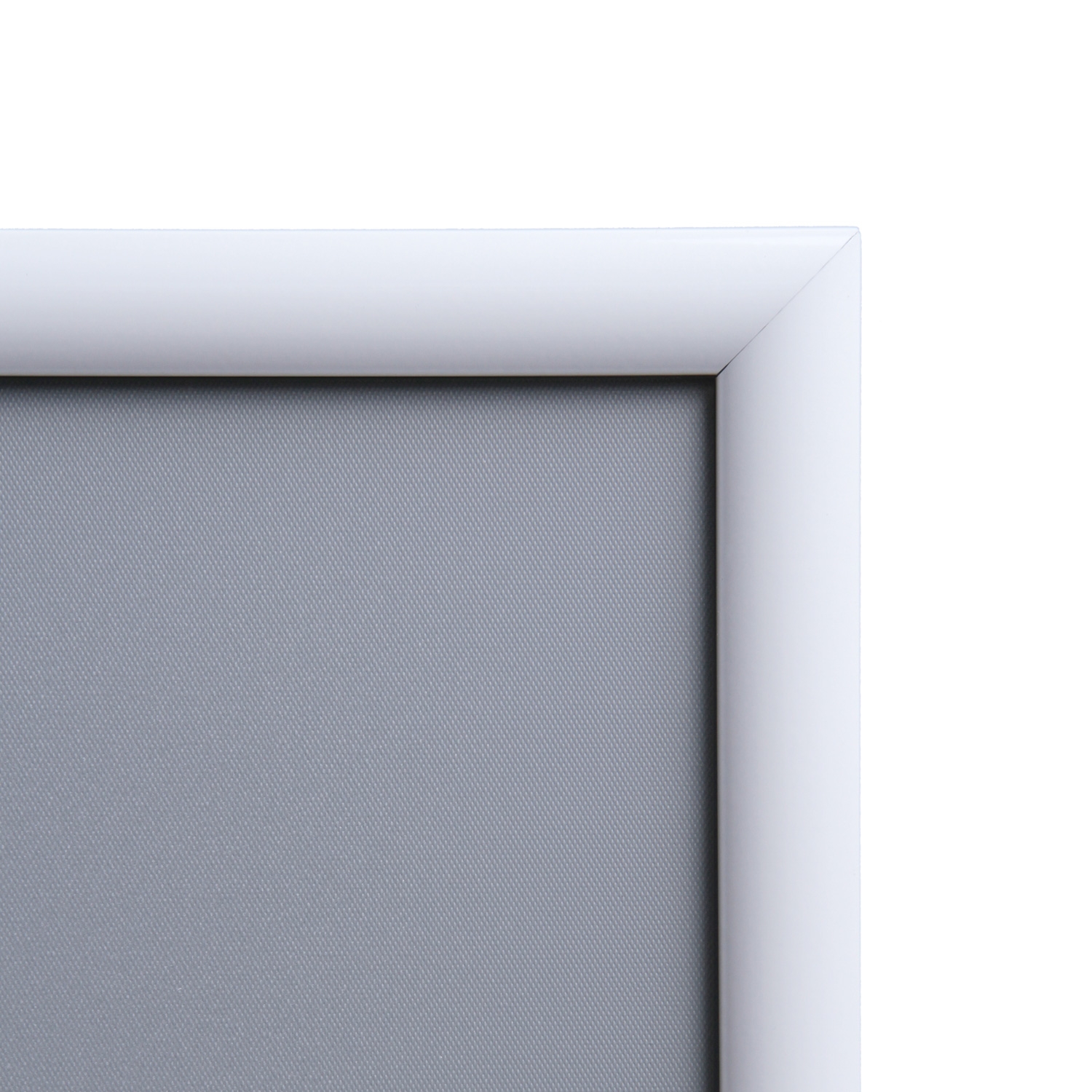 Klikkramme med buet frontprofil i RAL 9003 (hvit) med halvblank finish og gjæringshjørner.
