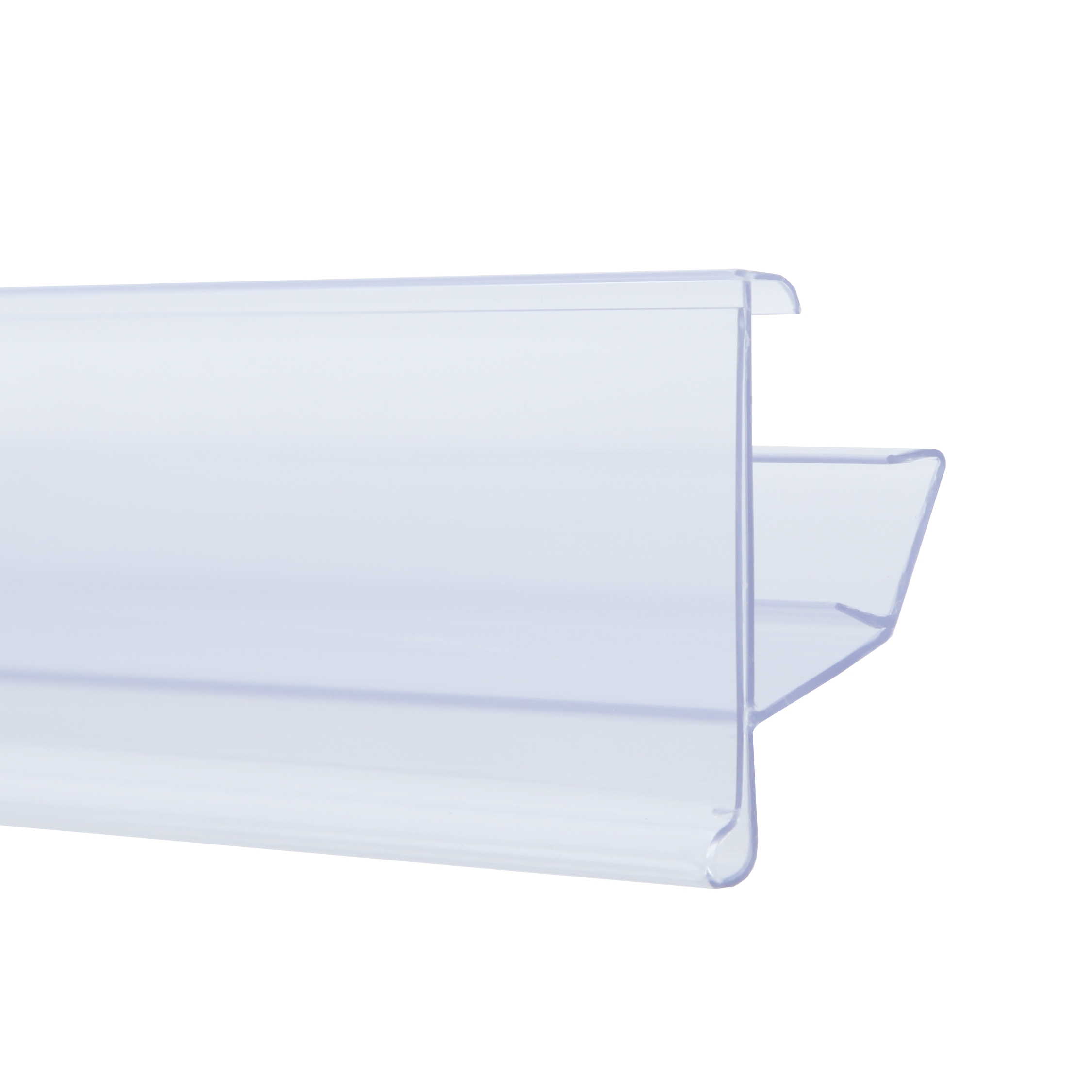 Hylleforkant / etikettlomme ( 39 x 1000 mm ) Designet til at bli klikket fast på Linde, Storebest, og Adams hyller. Disse hylleforkanter er utført i transparent plast og monteres og avmonteres lett via deres klikk av- klikk på funksjon.