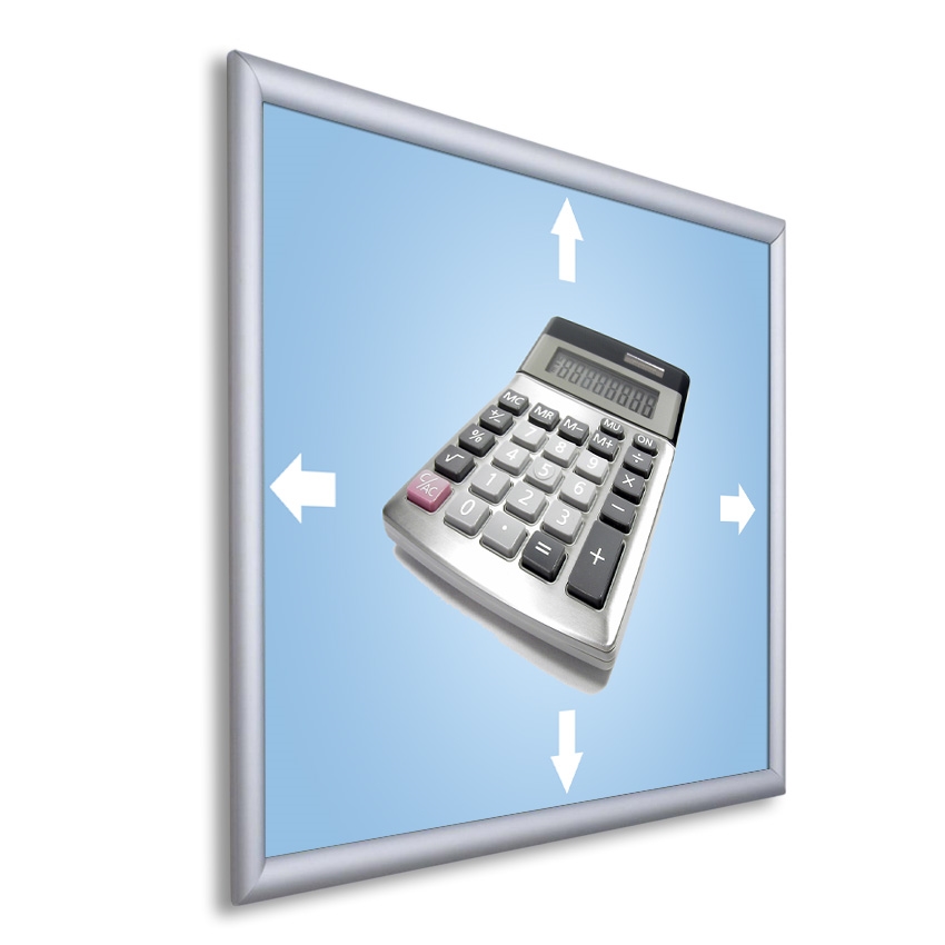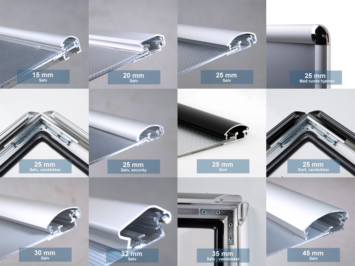 Skal rammen være stor (over 1 kvadratmeter, f.eks. 100x100 cm), anbefaler vi å ta en større profil (minst 30mm). Dette fordi den større profilen vil ha bedre grep på plakaten og frontplaten og dermed gi et mer solid hold.