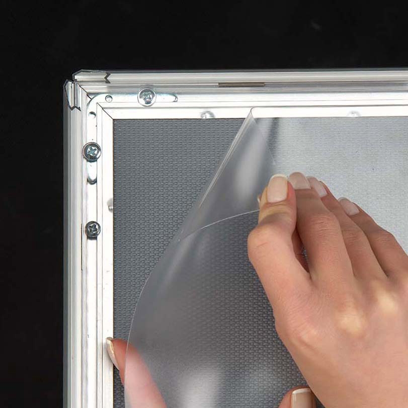 De fire sidene av den klikkramme åpnes ved å trykke fingertuppene langs sidene for å få tilgang til utskriften eller brosjyren som skal vises. En antirefleks frontplate er inkludert for ytre beskyttelse.