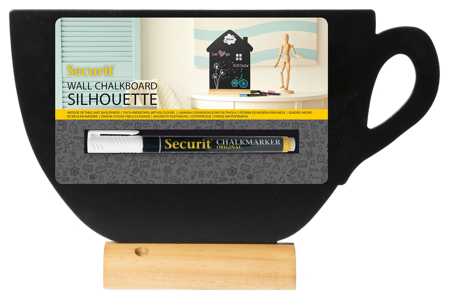 Dobbelsidig kopp Silhouette tavleskilt til bord med stilig fot i teaktre. Inklusive hvit kritt marker penn med skrivebredde 1 og 2 mm. Silhuetten kan tas opp av foten, og flyttes over til en annen av samme type