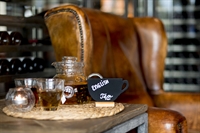 • Dobbelsidig tavleskilt til bord med stilet fot i flott teaktre