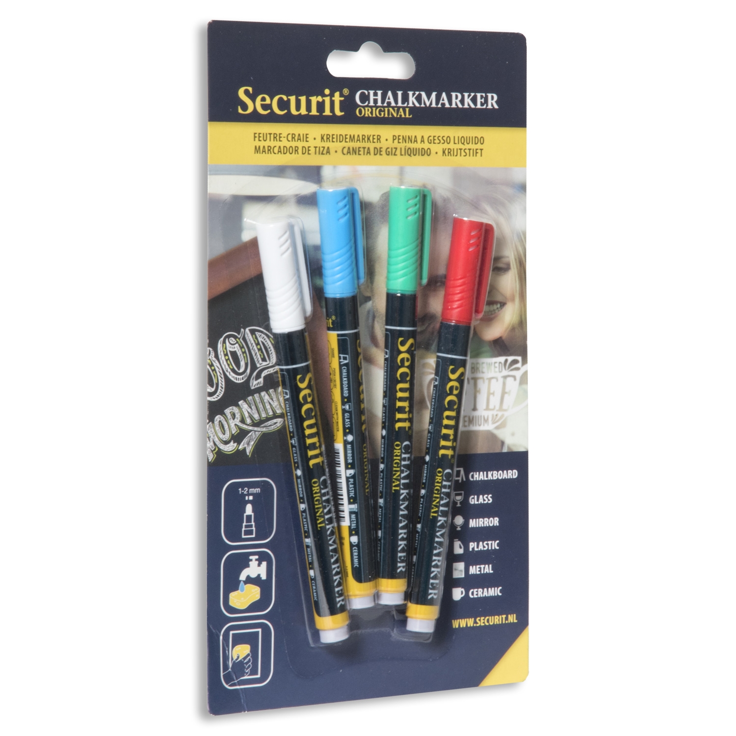 Sett med 4 SECURIT originale Krittpenn med 1-2 mm spiss i hvitt, rødt, blått og grønt.