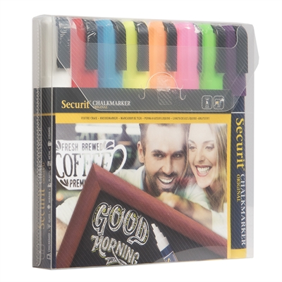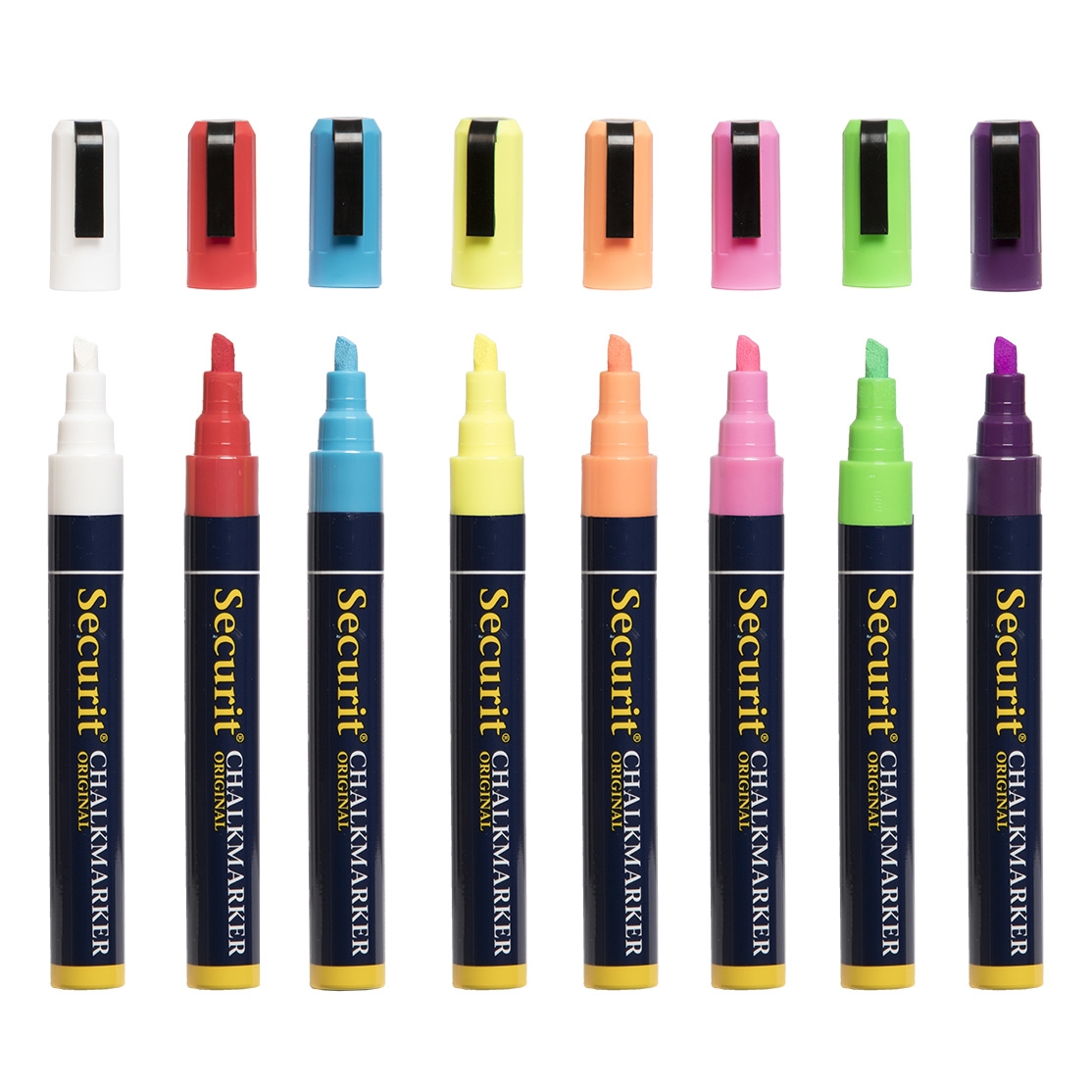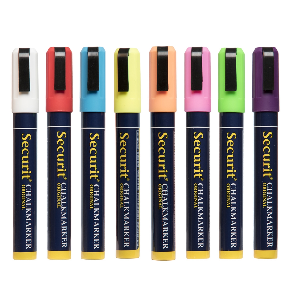 Sett med 8 Medium SECURIT Originale krittusjer med 2-6 mm spiss i hvit, rød, blå, gul, oransje, rosa, grønn og lilla.