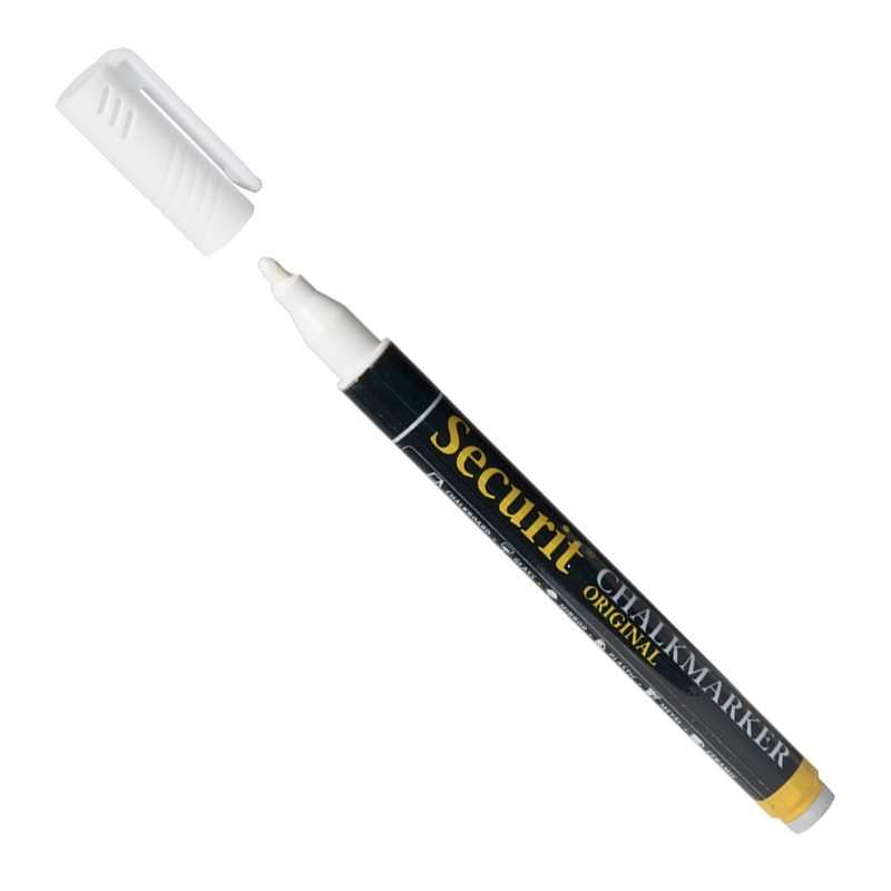 Hvit SECURIT Original krittusj med 1-2 mm spiss.