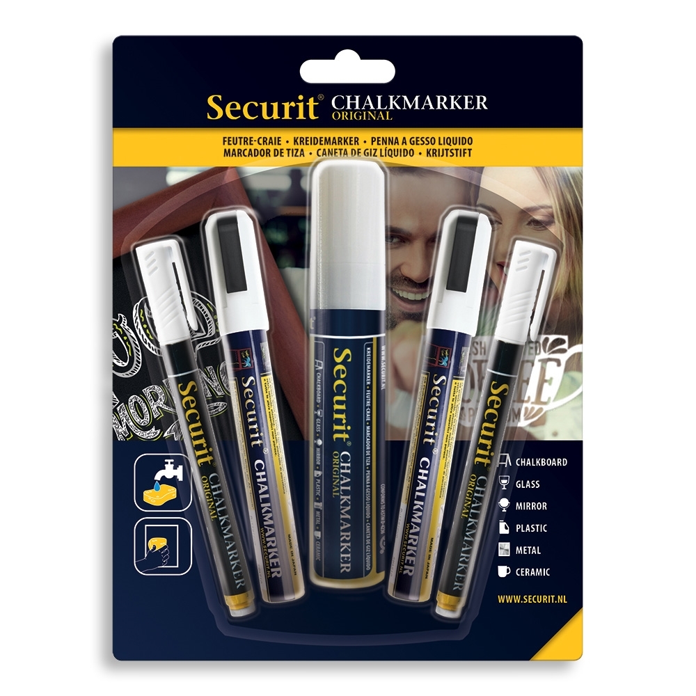 Pakke med 5 hvite SECURIT originale krittusjer - 1 stor (7-15 mm spiss), 2 medium (2-6 mm spids) og 2 små (1-2 mm spids).
