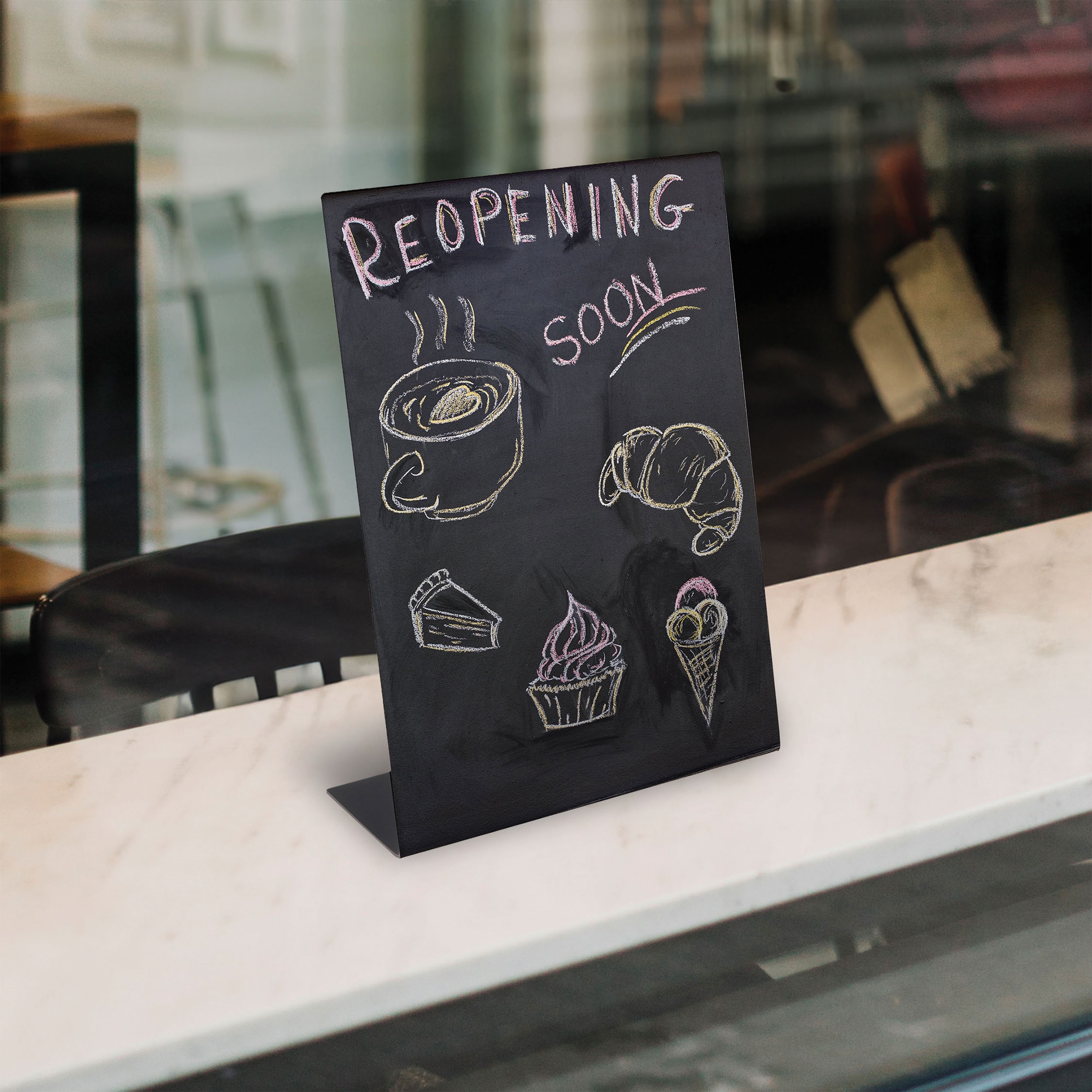 Tavlen står stabilt takket være den smarte L-formen, og den lett bakover skråningen gir optimal lesbarhet fra kundens synsvinkel. Skriv enkelt med kritt- eller krittpenner, og rengjør tavlen raskt.