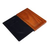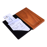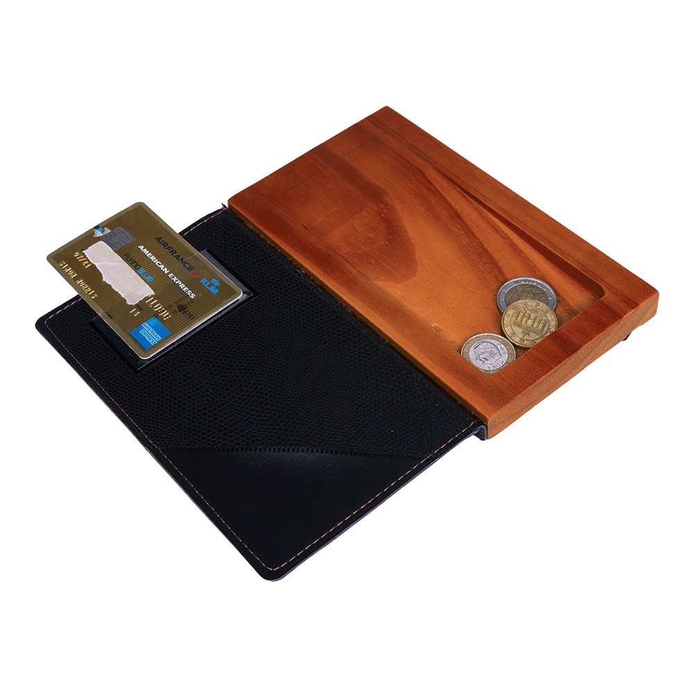 Flott vintage-look regningsomslag. Omslaget består av en mahogni farget treplate med fordypning som gir plass til småmønter samt sedler. Den svarte lærfront åpnes og inneholder to lommer i topp og bunn.