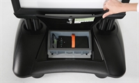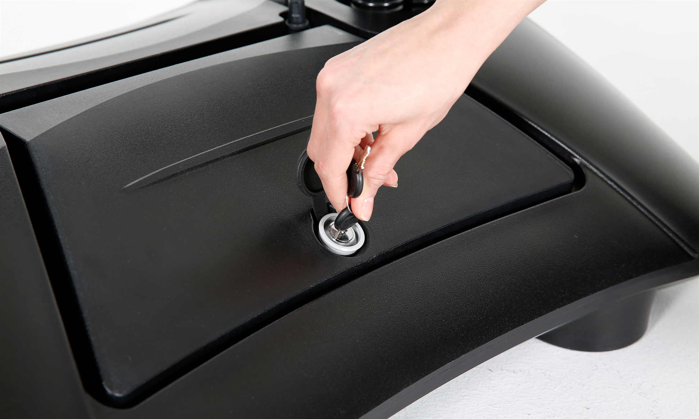 • Batteriet kobles lett til skiltet i et rom i foten som kan låses – nøkler medfølger