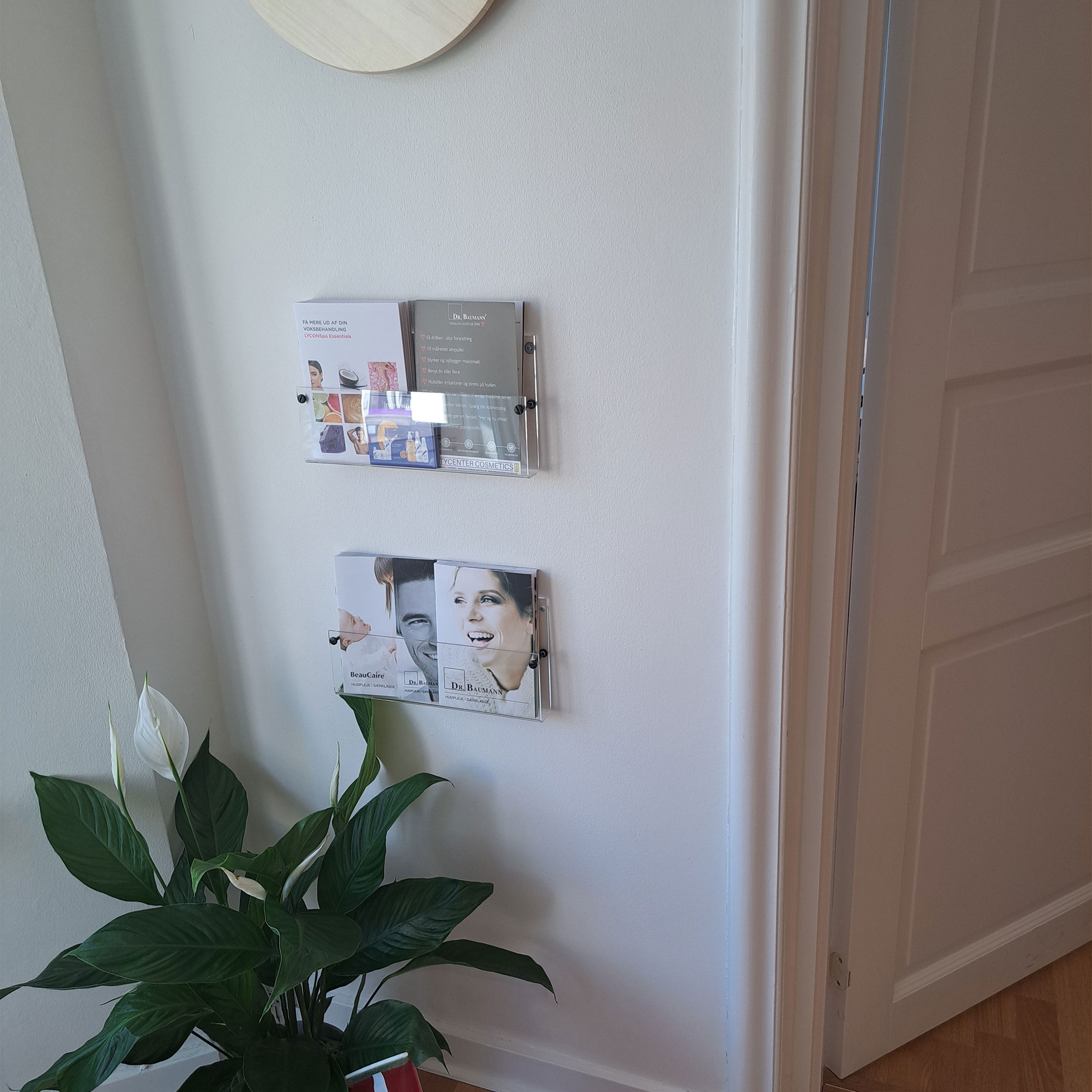 Luna akryl brosjyreholder med monteringshull til veggmontering.